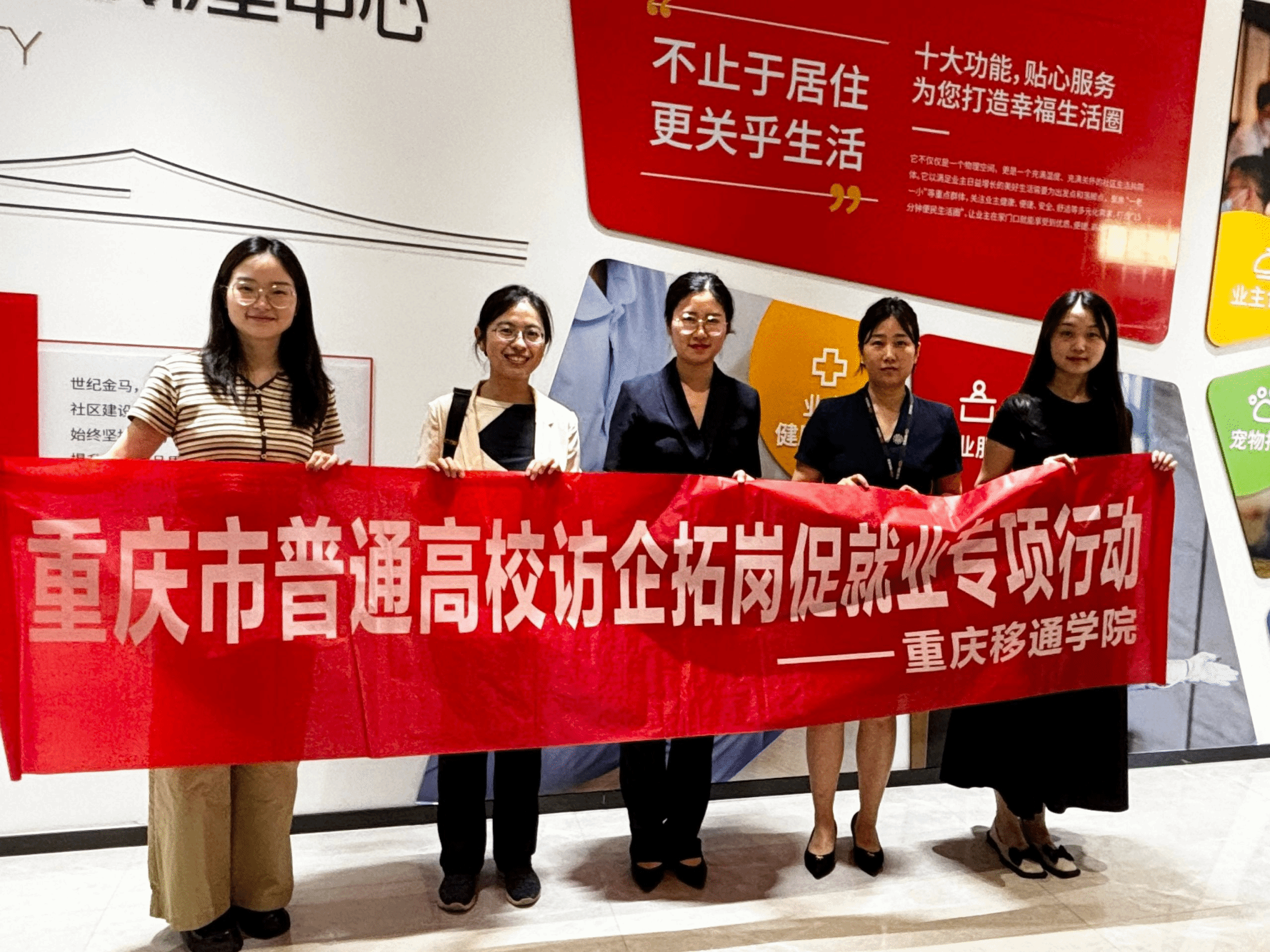 在重庆世纪金马实业有限公司相关负责人的陪同下,外国语学院一行人参观了智慧社区建设的创新成果和建设布局,企业相关负责人介绍:“近年来,我们聚焦创造自然、人文和谐的人居生活,追求产品品质,营造更加良好的社区氛围,对复合型人才需求激增,期待高校为企业注入创新活力。”陈锐老师表示,重庆移通学院始终以培养复合型人才为核心,通过校企联合的课程开发,助力学生职业发展。