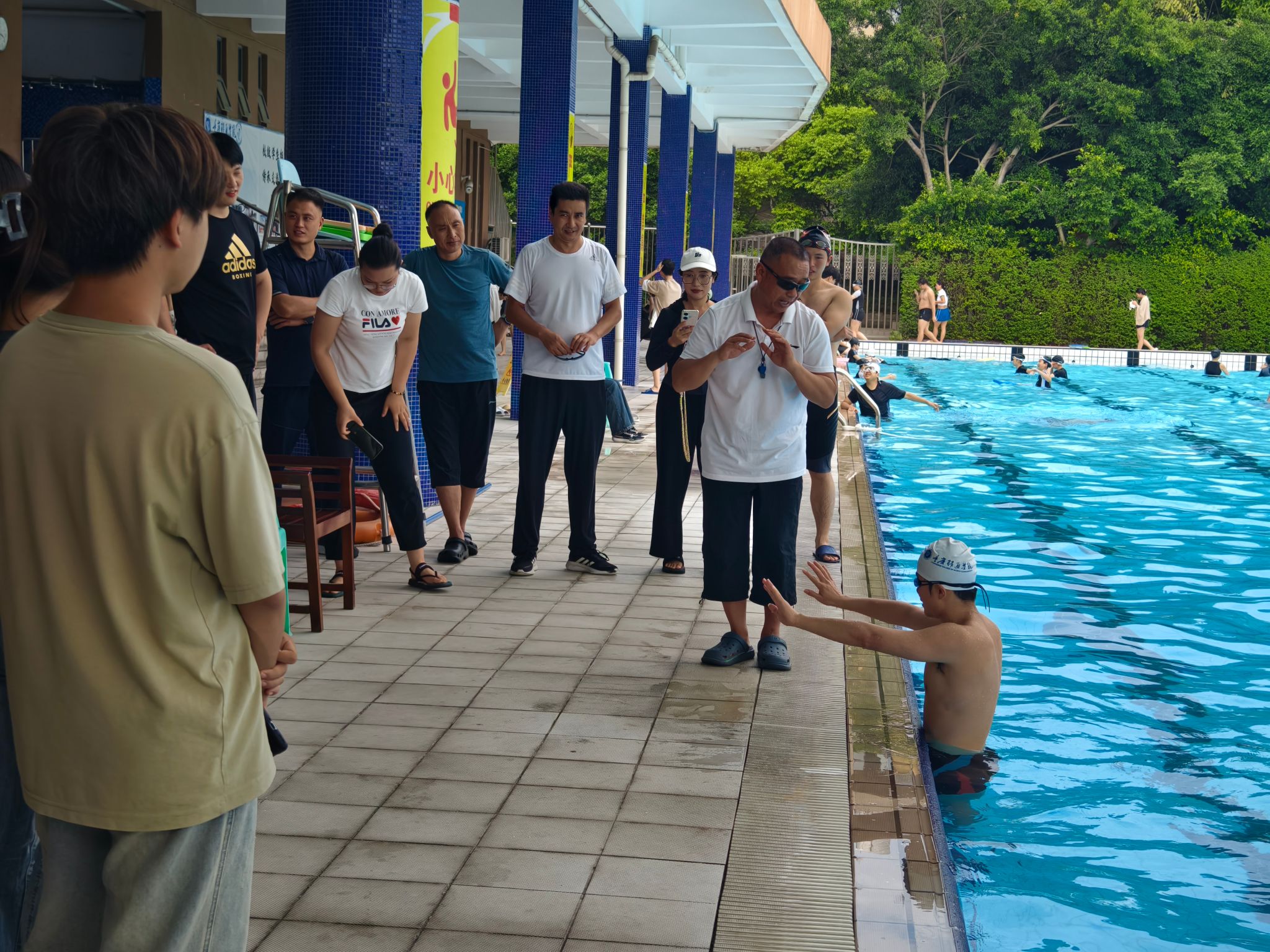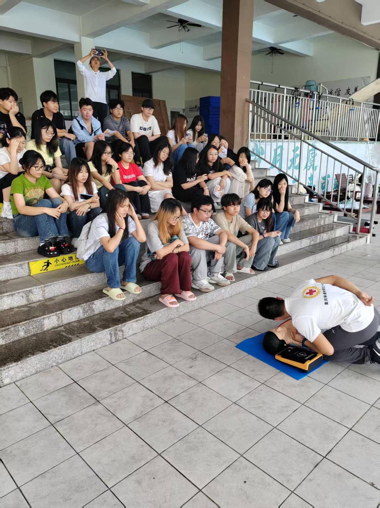 活动伊始,红十字会导师田威结合真实溺水案例,以通俗易懂的语言讲解心肺复苏(CPR)操作流程,现场演示胸外按压、人工呼吸的规范动作,并强调:“黄金救援时间仅4分钟,掌握急救技能可能挽救生命。”随后,游泳队教练罗聪带领队员展示蛙泳、自由泳、蝶泳等标准泳姿,分析不同泳技的适用场景与安全要点,同时提醒学生:“水域环境复杂,切勿盲目下水,安全意识永远是第一道防线。”最后,敖洪老师通过模拟落水场景,讲解抽筋自救、仰漂保存体力等实用技巧,并指导学生利用衣物、竹竿等工具实施他救,强调“科学施救”原则。