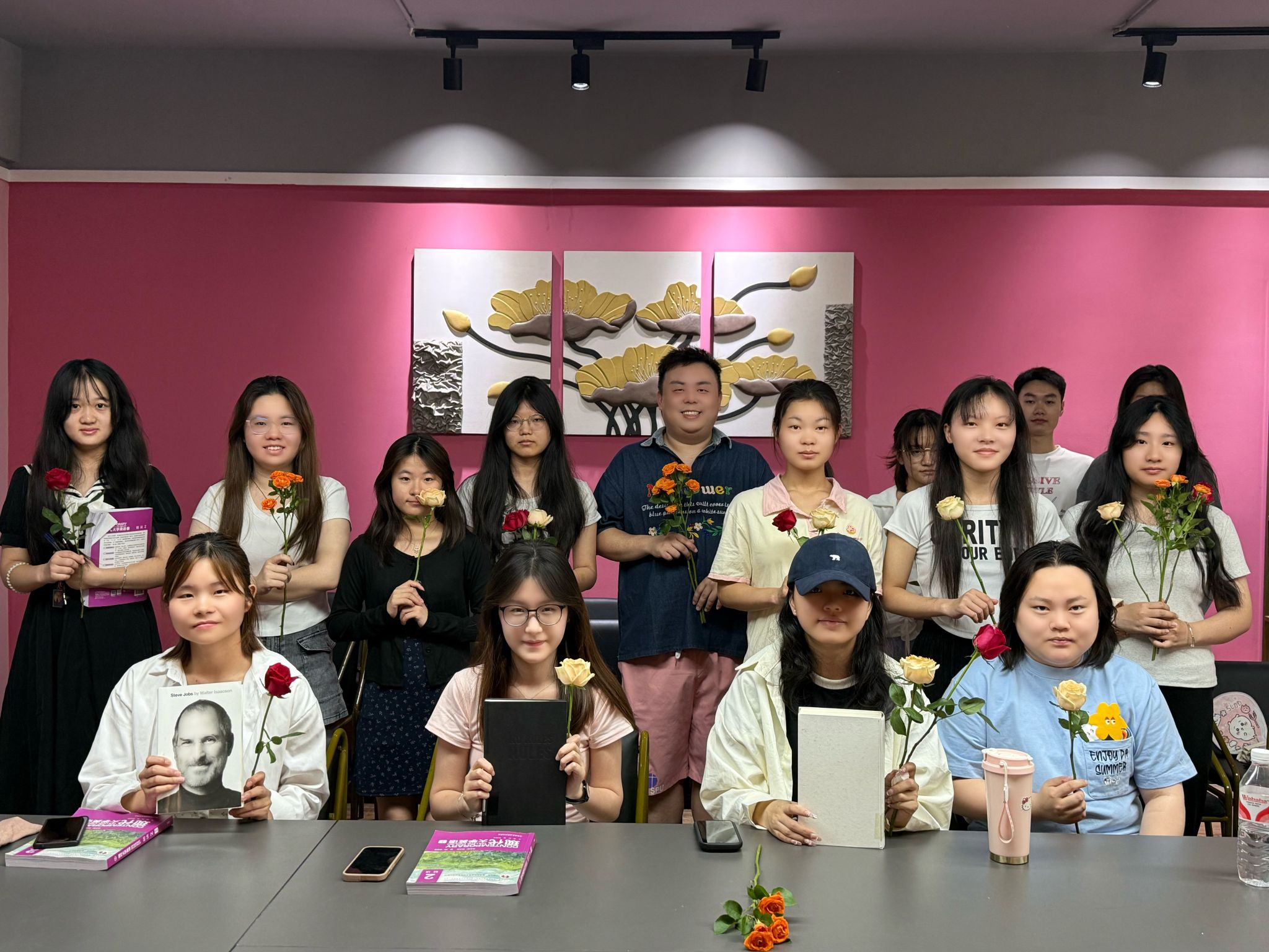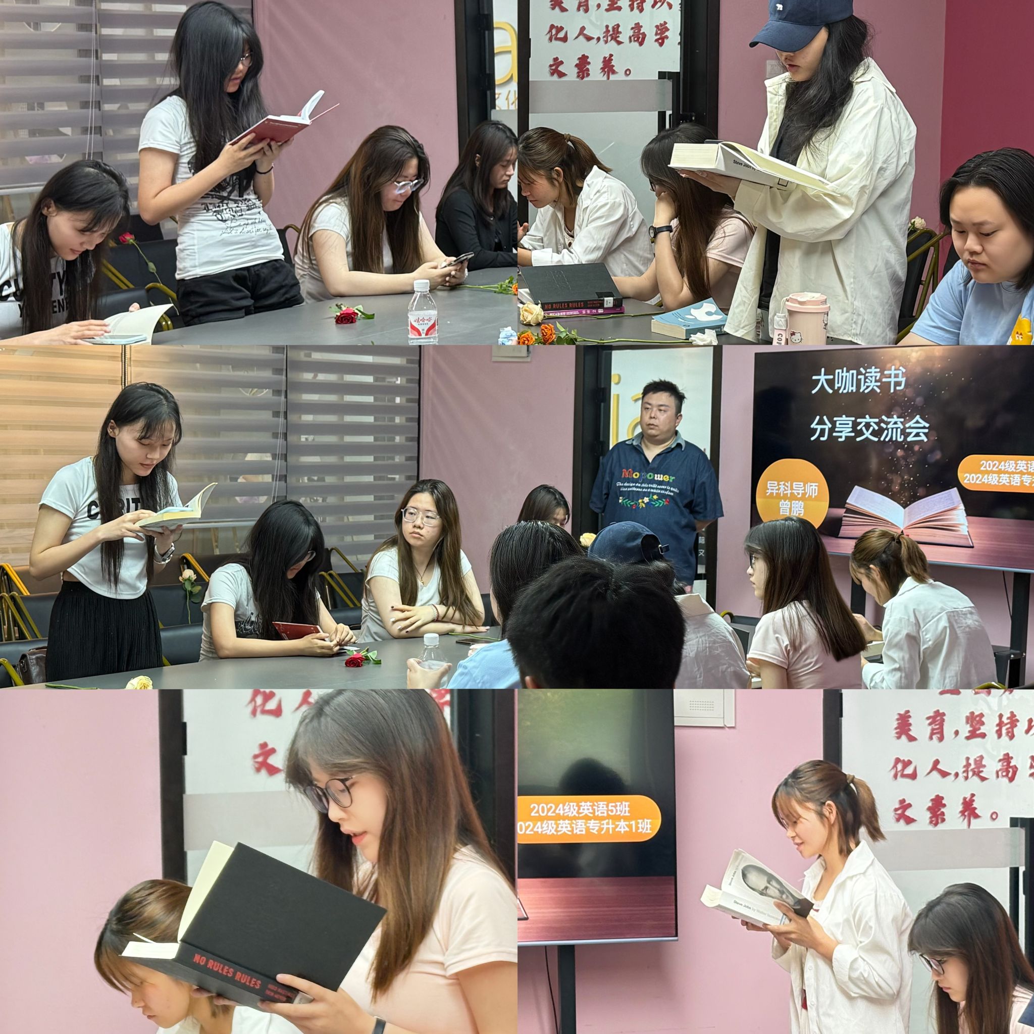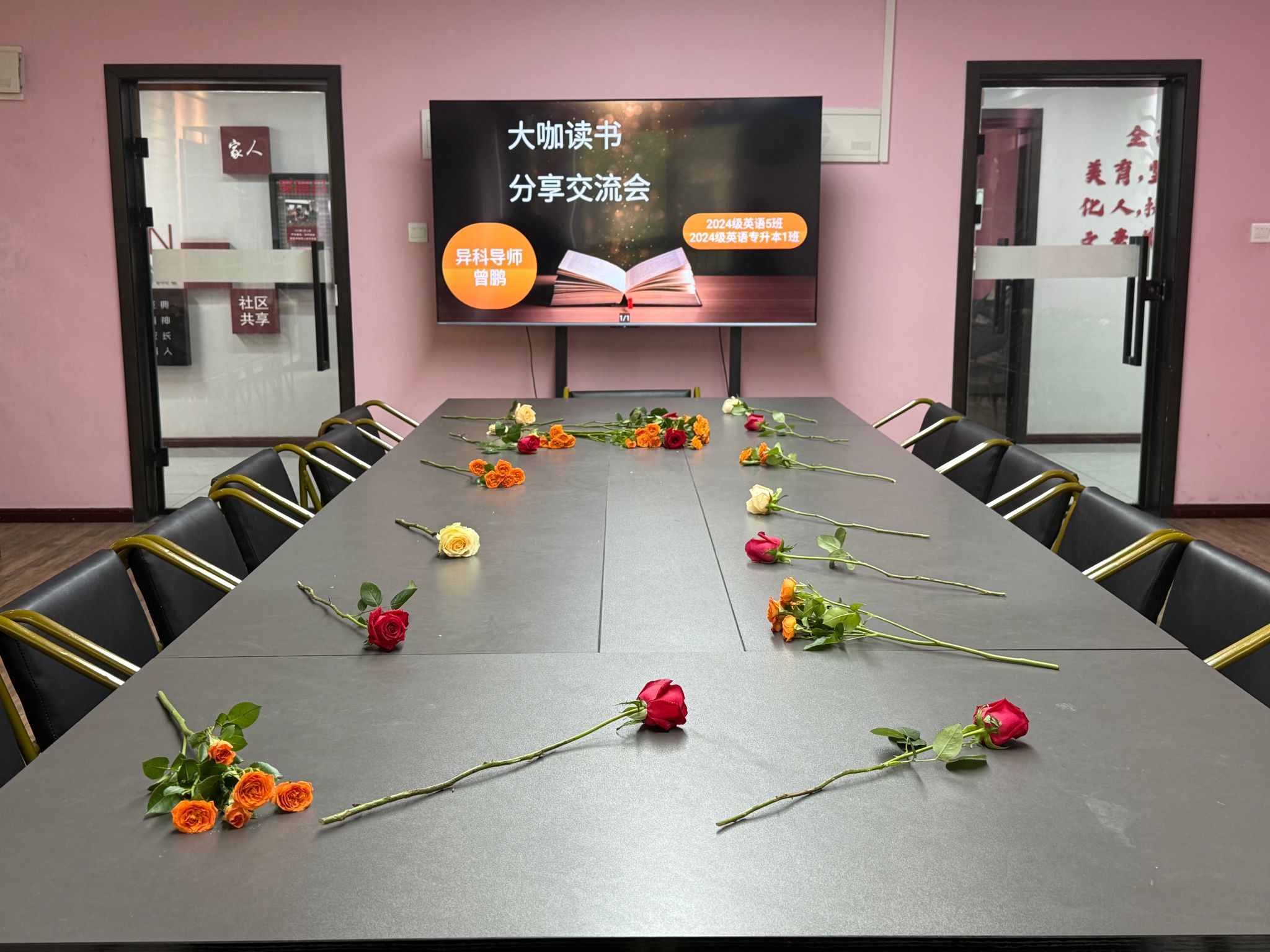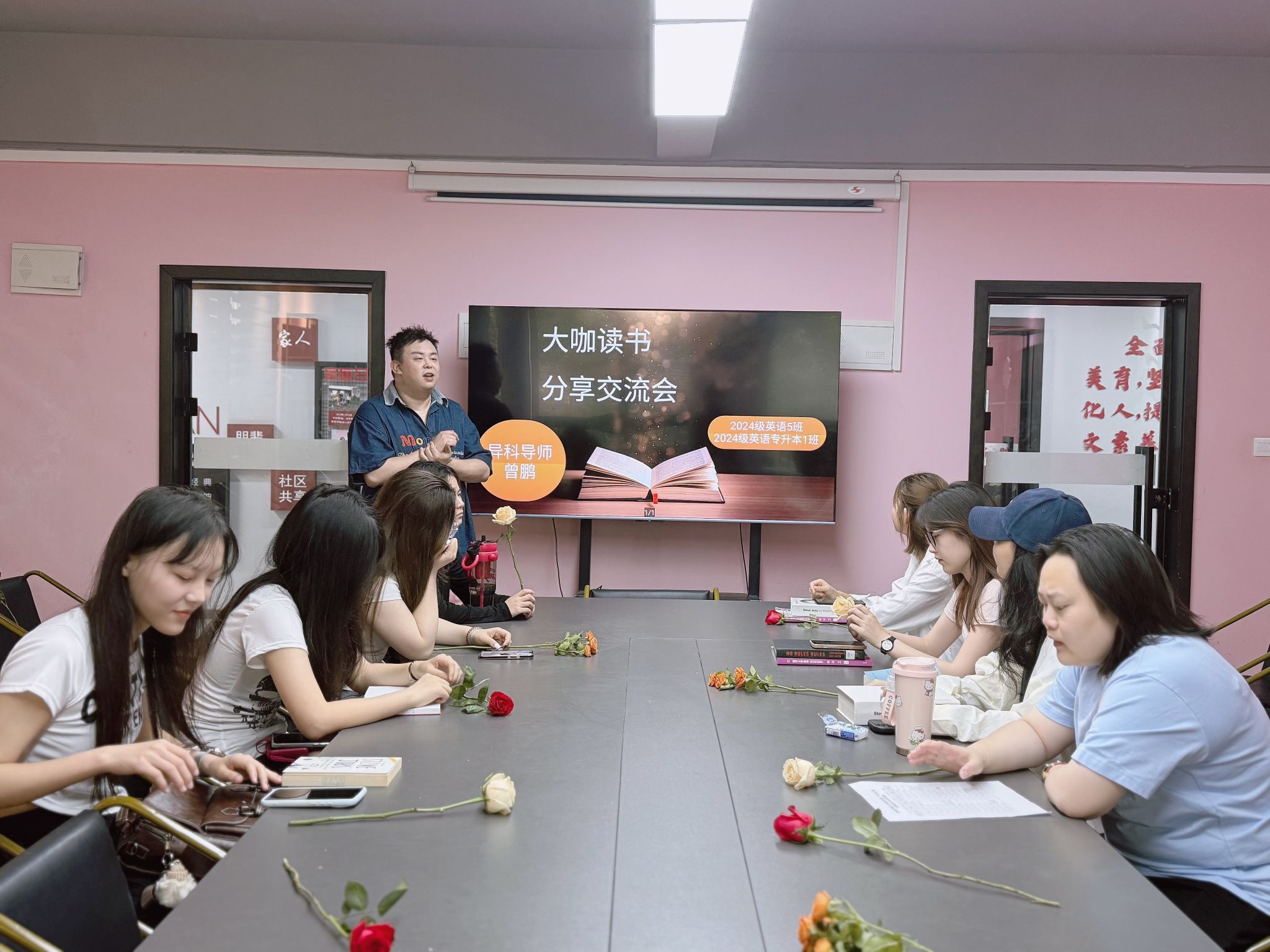 为营造书香校园氛围,培养学生自尊自信、悦己爱人的品格,异科导师曾鹏于5月21日上午9点至10点,在爱莲书院多功能会议室举办了一场大咖阅读分享交流会。活动以"玫瑰与书页共芬芳"为主题,通过赠花、阅读分享等环节,为2024级英语5班和专升本1班的同学打造了一场温暖而深刻的精神盛宴。