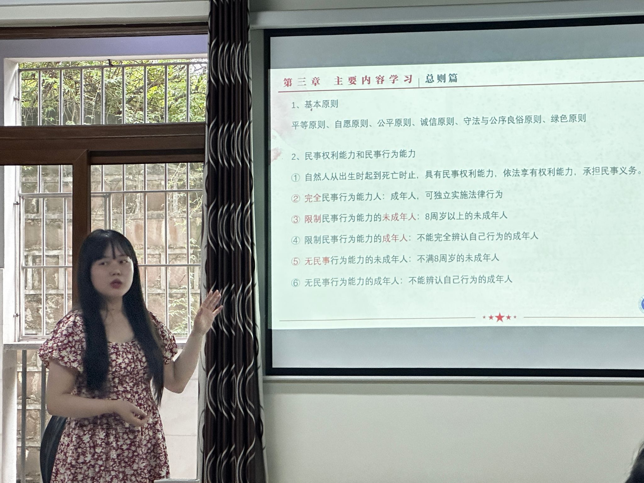 随着大家品尝完粽子,罗老师开始了对民法典的讲解。罗老师从民法典中对我们从出生到死亡的权利与义务进行深入浅出的讲解,重点讲解了总则篇中的民事权利能力和民事行为能力,合同篇中买卖不破租赁,以及人格权篇中对我们人格权的保障,还有对侵权责任篇中“自甘风险”、“自助行为”、高空抛物等系列侵权行为的讲解。同学们纷纷表示通过此次讲解增加了自己对于自身权利义务的了解,日后也会养成拿起法律的武器保障自己的权利的习惯。
