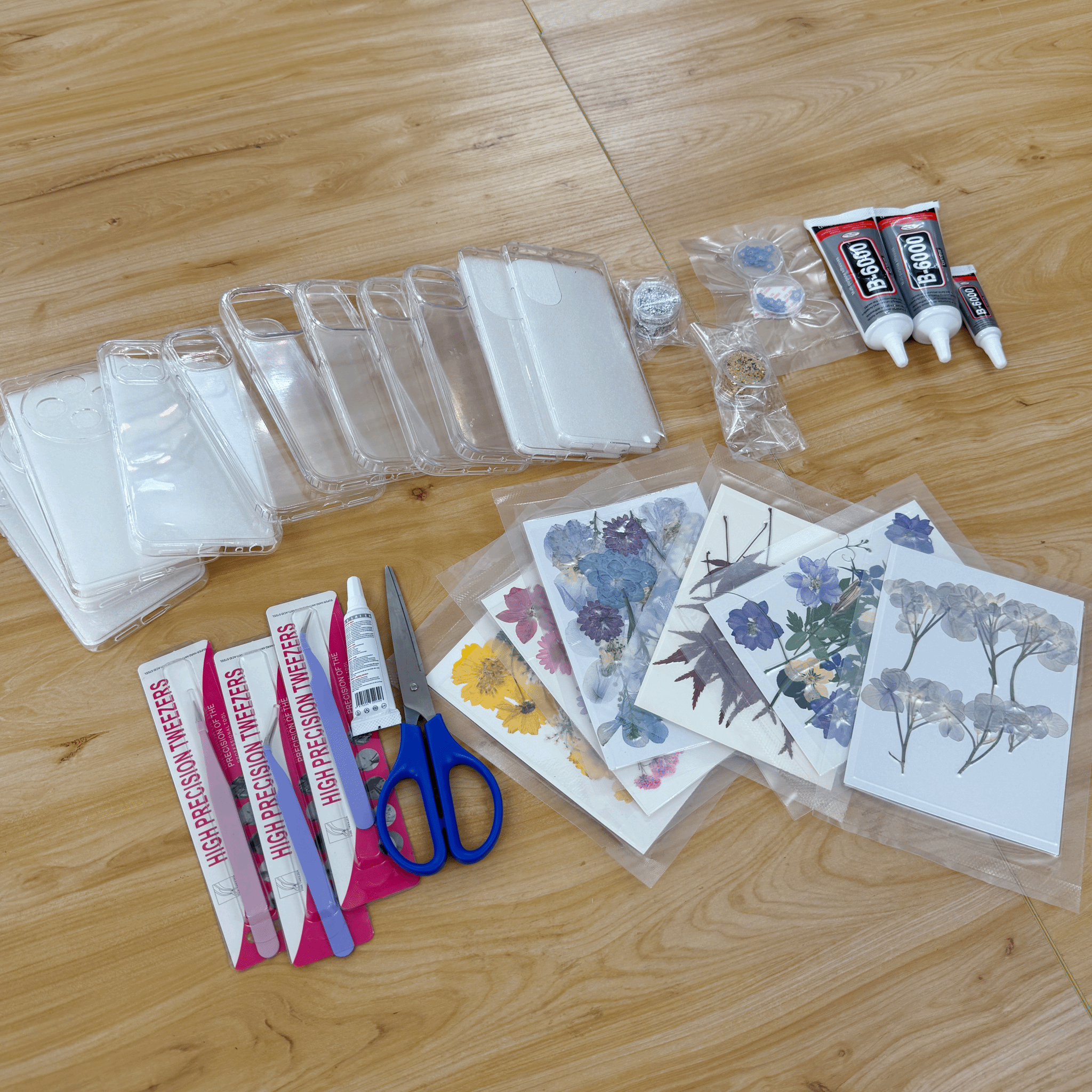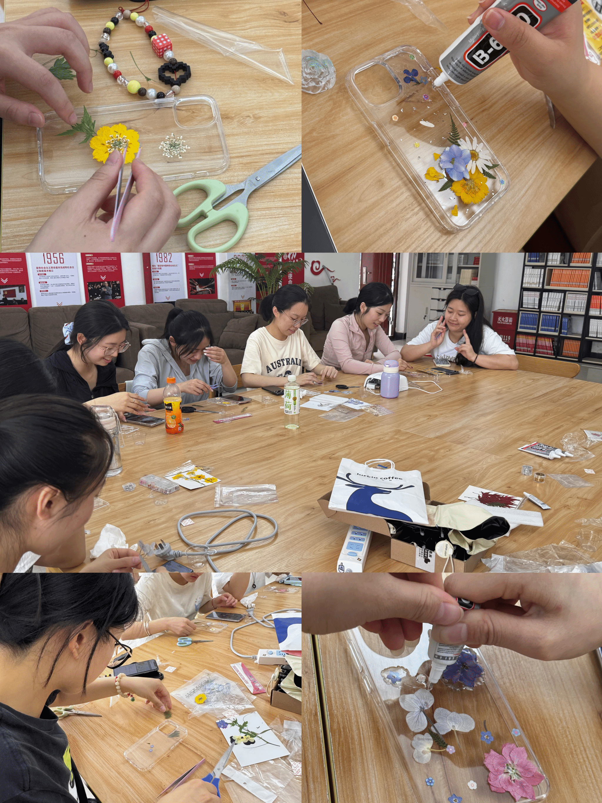 活动现场热闹非凡,桌上整齐摆放着各式各样的干花,还有种类繁多、琳琅满目的装饰材料,这些丰富的材料为同学们提供了充足的创作素材,瞬间点燃了大家无限的创作灵感。活动开始前,韦兵熠老师进行示范讲解,介绍了手机壳制作的步骤和技巧,比如怎样粘贴干花才能既牢固又美观,以及如何巧妙搭配贴纸的颜色和图案,让整个手机壳的设计更加和谐统一。