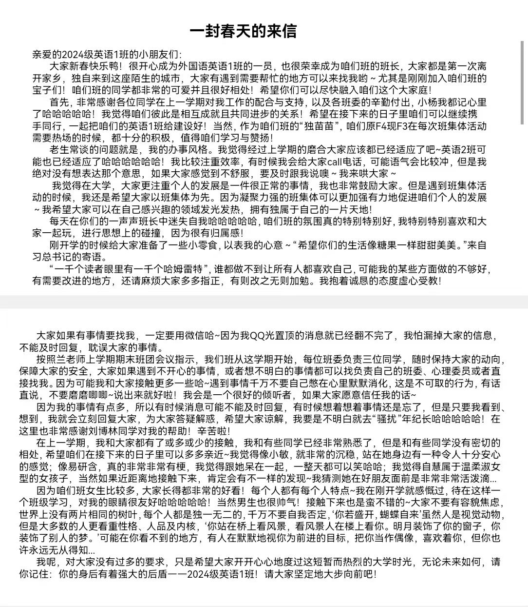 第二部分由班长亲自写给同学们的一封信及其自身在班级中感受到的许多温暖瞬间组成。信中有对新同学尽快融入班级的期望、上一学期大家配合工作的感谢、希望大家勇敢做自己;不要有容貌焦虑;“你若盛开,蝴蝶自来”、鼓励大家注重个人发展;可以在自己感兴趣的领域发光发热;拥有独属于自己的一片天地、希望大家坚定地大步向前、珍惜这短暂而热烈的大学时光。也谈到了其自身的办事风格,并提到“一千个读者原来有一千个哈姆雷特”,有需要改进的地方还烦请大家多多指正,有则改之无则加勉,班长将抱着诚恳的态度虚心受教。还再次强调班集体活动的重要性,凝聚力强的班集体可以更加强有力地促进班级同学个人的发展!各种暖心瞬间的记录是其从大家那里获得无数个暖心的瞬间后给大家的反馈,也是班长给大家准备的一点小心意。