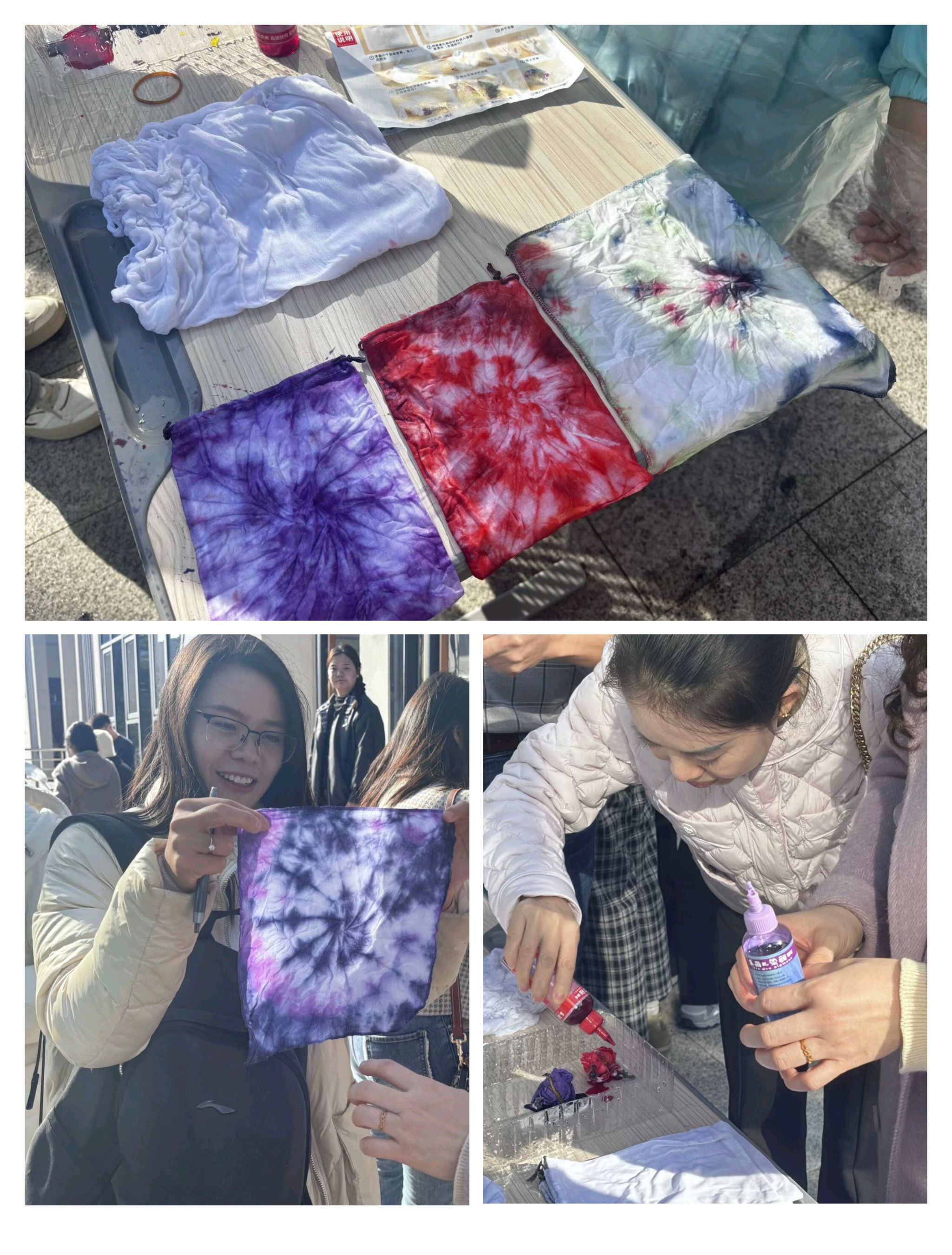 织物在染色时部分扎起来使之不能着色的一种染色方法,是中国民间传统而独特的染色工艺之一。教师将手帕折叠出各种形状,用橡皮筋扎牢,涂上染料,创造出独一无二的样式造型。老师们发挥自己的想象力,缠绕手帕,并点上所选取的色彩,缓缓滴下,静静等待, 片刻之余绚烂绽放,见者手舞足蹈,大家投去艳羡的目光,拍手叫好。