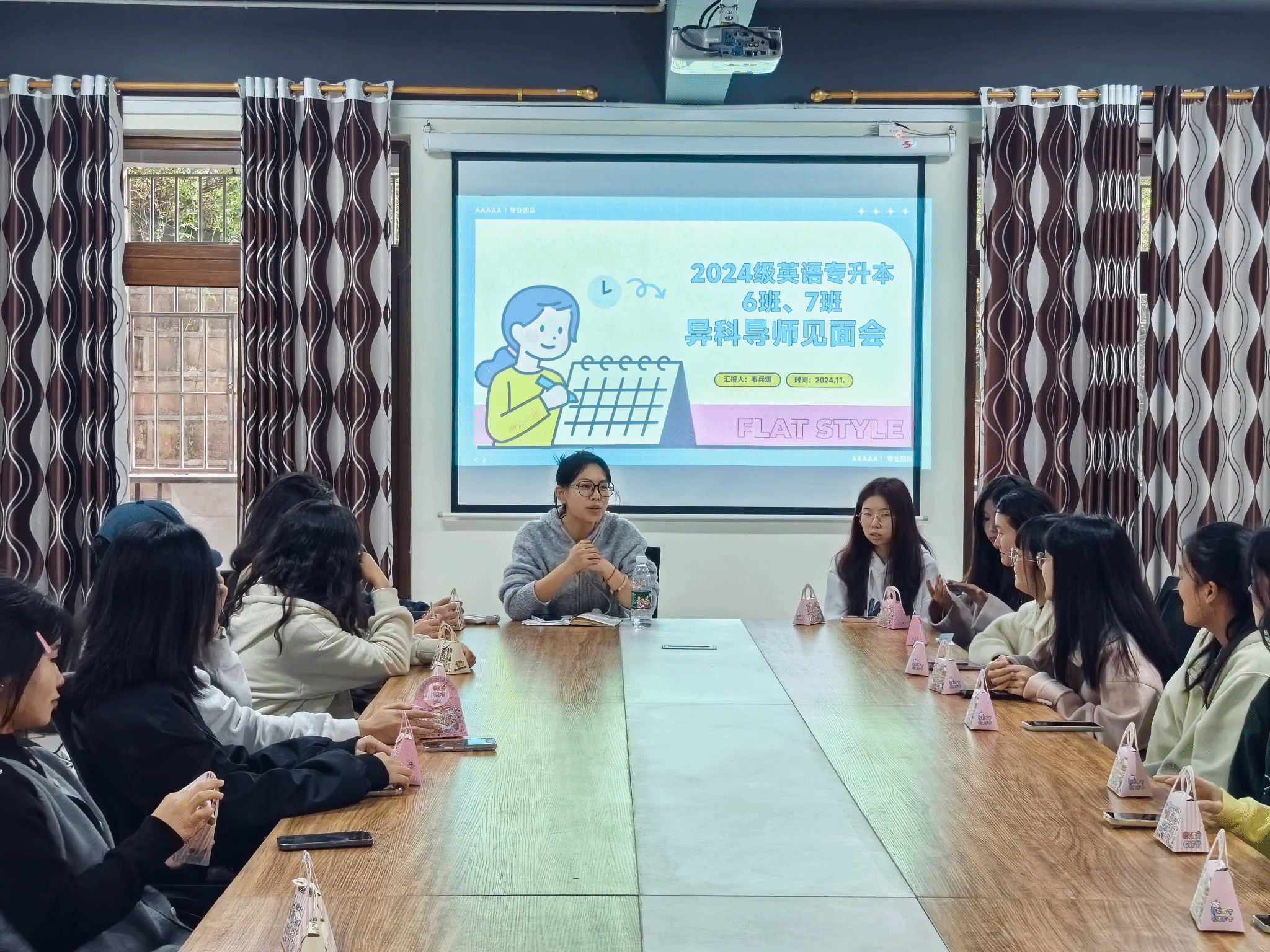 2024年11月8日,一场别开生面的异科导师学生见面会在行者书院群荷悦112会议室开展,2024级英语专升本6班、7班的同学积极参与。此次见面会旨在老师与学生相互认识,向学生介绍异科导师职责与工作,加强师生之间的沟通与联系,并为接下来的学期工作打下坚实基础。
