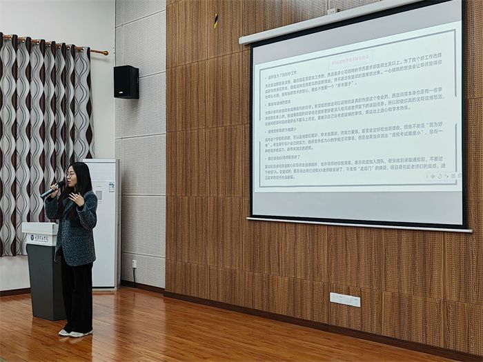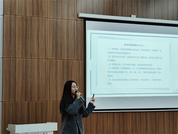 活动伊始,刘佳昕老师向在场同学分享考研复试经验,以“过来人”的身份为在场同学提出宝贵建议,简明扼要地从考研复试的淘汰机制、以及其总成绩占比等方面为在场同学介绍相关详细信息。在佳昕老师的详细介绍后,同学们了解到考研复试一般采取差额复试的方式,根据各种情况进行综合分析。除此之外,佳昕老师还着重强调,抛开初试成绩,同学们也需要注重复试相关事宜,即使初试分数再高也可能会出现不予录用的情况,面对这种情况,我们不必惊慌,路途坎坷,但是我们有无穷尽的勇气去面对未知的艰难险阻。
