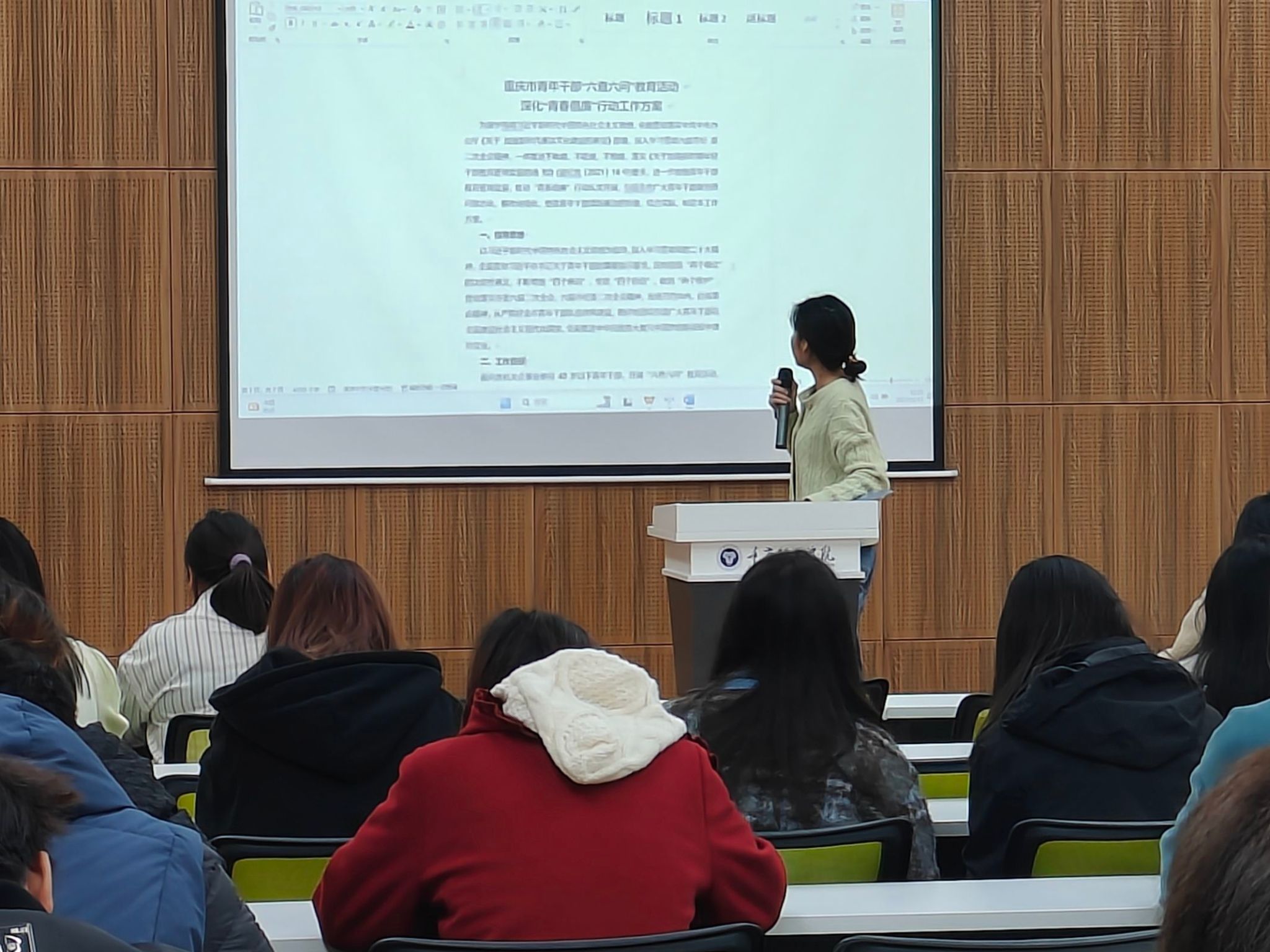 培训伊始,外国语学院团总支学生副书记夏彩琳带头领学了《重庆市青年干部“六查六问”教育活动深化“青春倡廉”行动工作方案》文件精神,呼吁在座各位共青团员和学生干部,作为同学们学习的榜样,要保证自身廉洁,应以“廉洁自律、勤俭务实、诚实守信、自律自强”为要求,扣好人生的第一粒扣子,志存高远,坚定信念。