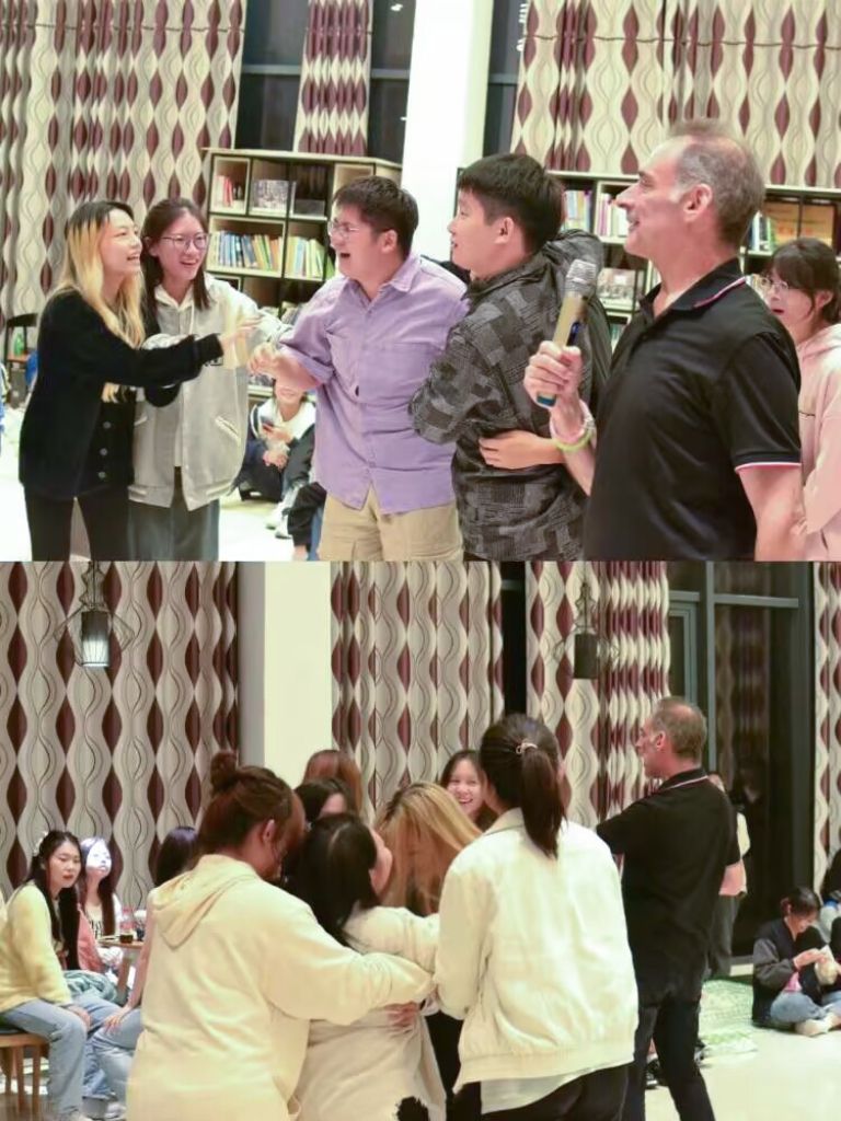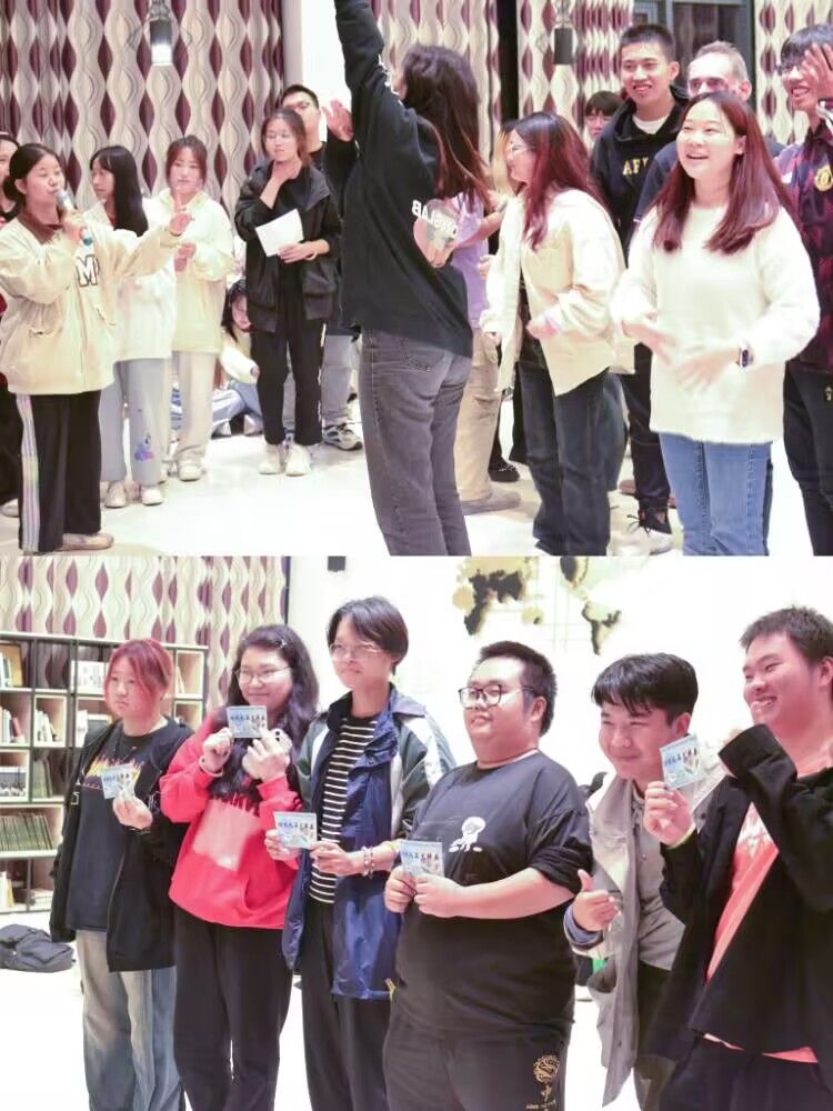 轻松愉快的趣味游戏环节为同学们搭建了一个与Clive亲密互动的平台。第一场游戏——“你演我猜”。该游戏由Clive给大家提供一个词语,同学们通过丰富的肢体语言向组员表达关键词义,猜出正确答案。有趣的动作引得全场翻然大笑,为此次活动迎来高光时刻。