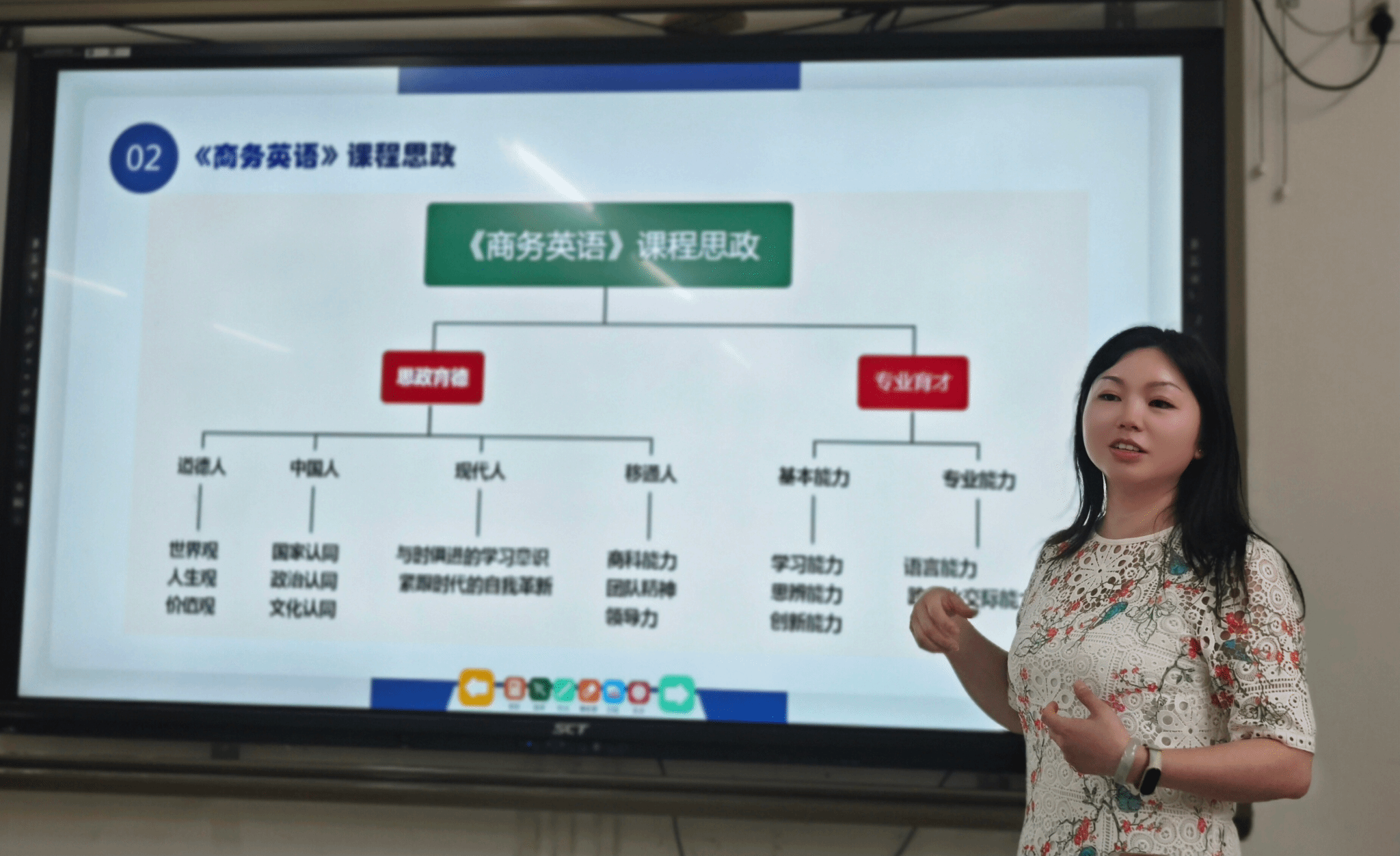 随后,团队成员魏铃老师与大家分享了如何从思政育人、专业育才两个方面,道德人、中国人、现代人、移通人、基本能力和专业能力六个维度搭建《商务英语》课程思政理论框架,实现思政与专业教学有机融合。同时她结合我校办学定位和英语专业人才培养方案进行示范案例分享。她谈到:《商务英语》是商科知识与语言结合的经典,亦是英专学生求职的一个突破口,在教学中我们可以充分挖掘与“移通”契合的思政元素,不断提升学生的商科思维能力、创新意识和领导力。