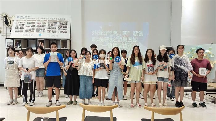 2023年5月31日,外国语学院“昕”就创——职场探秘之旅第四期销售岗位篇,在天渠玻璃房圆满举行。此次活动外国语学院就业助理团以打破学生对于销售岗位的信息壁垒,培养学生的职业素养,以及更好地将理论与实践融会贯通,更好地适应未来的工作为宗旨。让同学们通过有关销售知识的活动体验,更深入了解销售岗位,进而让学生辐射思维,灵活地找到自己心仪且合适的职业。