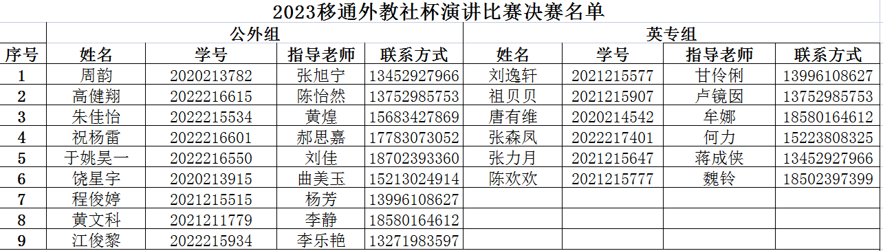 2023年4月26日下午四点,第十五届“外教社”杯重庆市民办本科高校独立学院大学生英语演讲比赛重庆移通学院校内选拔赛决赛,于天空钢琴教室(天空503教室)举行。本次比赛分为两组进行,第一组为大学英语组,第二组为英语专业组,两组选手按照所抽签的顺序依次上台进行演讲。演讲比赛内容分为命题演讲,即兴演讲以及评委提问三个环节,命题演讲的题目为Make the world a better place。本次活动邀请曾泽军老师,蒋成侠老师,陈华艳老师,李乐艳老师,朱陶老师,外教Clive,外教Israel,外教Marvin八名老师担任本次大赛的评委。