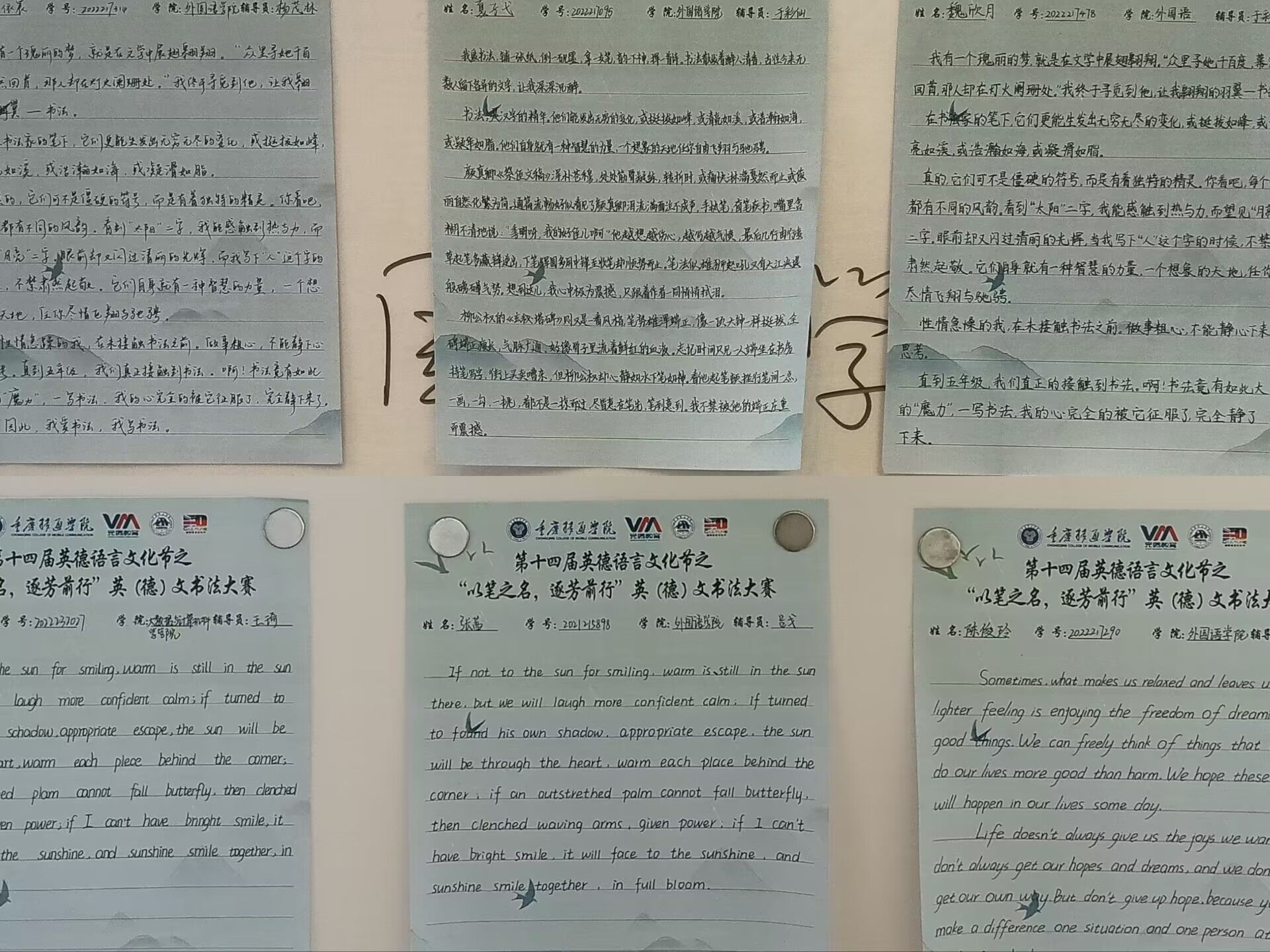 书之为妙,近取诸身,远取诸物。书法作品不仅能够传达字墨之间的文化内涵,更能够唤起人们的思绪和对书法的赞叹。外国语学院学生会学习部不仅与书法协会联合举行了“以笔之名,逐芳前行”英德文书法大赛决赛,还与外国语学院青年志愿者协会蒲公英课堂支队联动融合,将英德语言文化节与书法大赛带进社区。