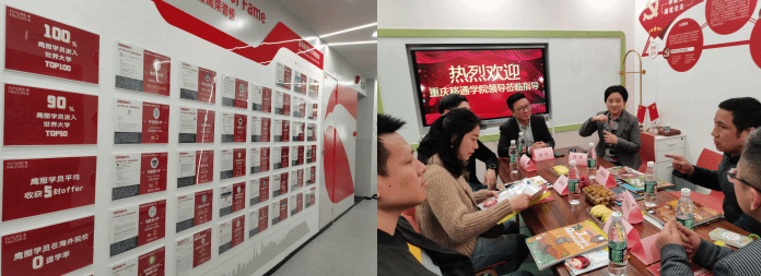 在走访欧文教育科技集团有限公司时,简短的相互介绍认识之后,在欧文总裁黄伟先生带领下参观了位于解放碑的总部、校区以及鹰图留学(欧文集团的留学部。参观之后一行人围坐在会议室内进行深入的交流,黄总为大家介绍了欧文集团的核心业务板块、集团规模(500多名老师,37个校区)。外国语学院主要为英语和德语两个专业,学生就业去向和选择整体偏向各级各类教育培训单位和企业,在未来,希望欧文和学校加强合作,也希望学校能够为企业输送更多的人才,促进学校和企业双赢局面。