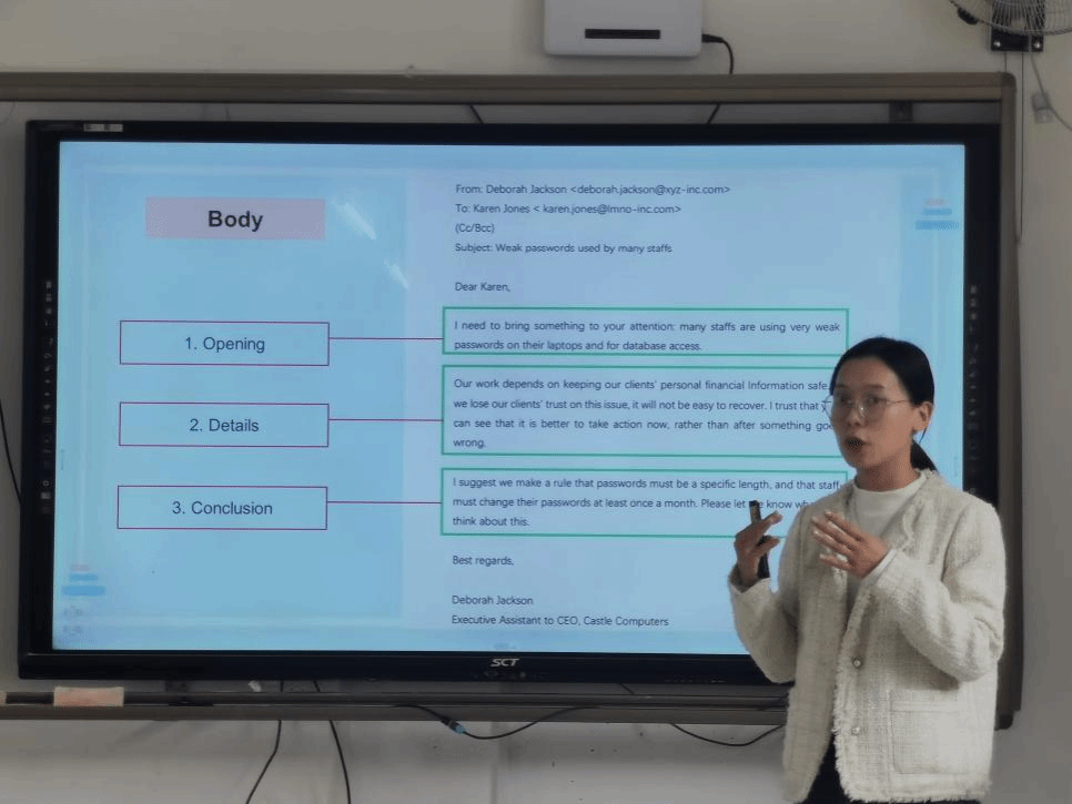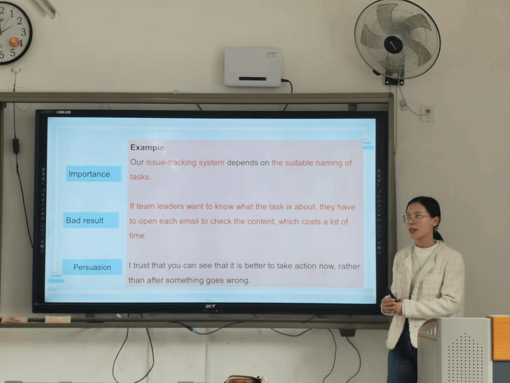 第二位参赛选手是《IT行业职场英语》课程小组的杨敏老师,她带来的授课内容是职场中的邮件写作。杨敏老师以IT行业沟通过程中常出现的沟通为出发点,结合案例issue-tracking system相关问题让学生进行邮件写作,并结合邮件写作范文,直观地向学生展示邮件的基本格式;同时将主体部分写作作为本次课程的教学重点,将主体部分分成introduction,details以及conclusion三个板块,讲到相应版块时,杨老师补充相关句型和相关写作范例展开逻辑。这样化繁为简的教学方式以及结合职场相关场景的案例,既可以激发学生兴趣,又能让学生迅速掌握邮件写作的要领。