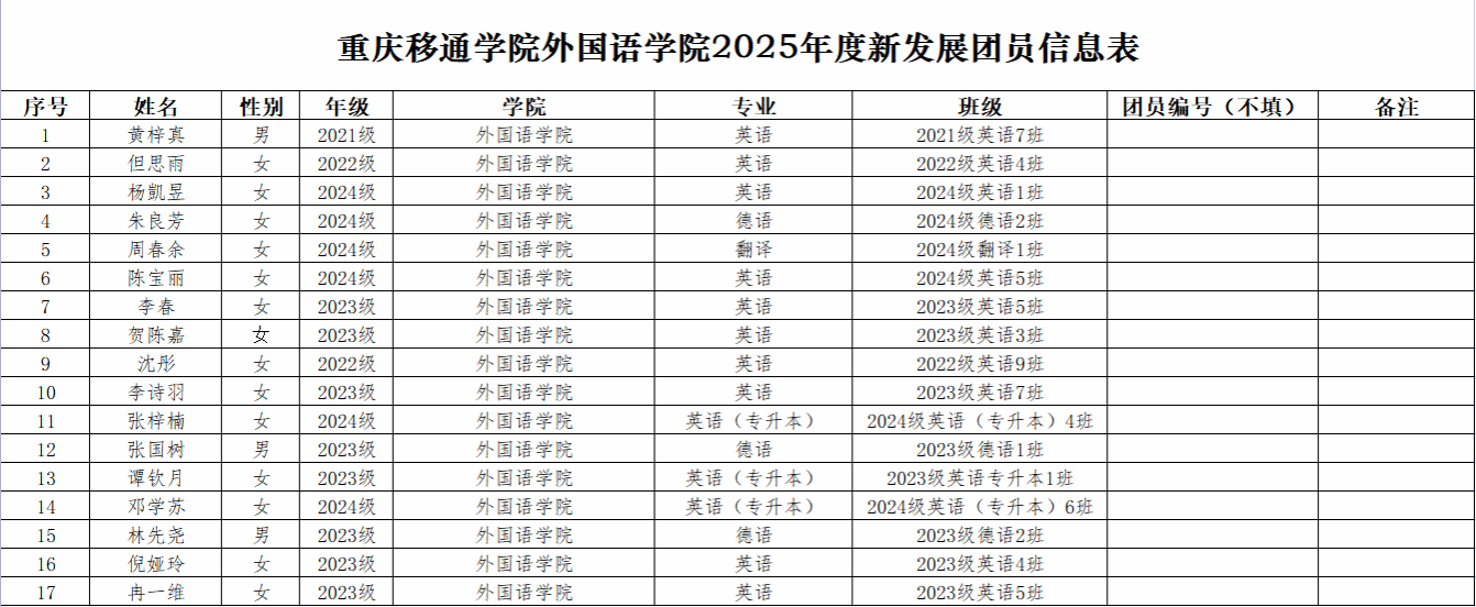 为深入贯彻落实习近平总书记关于加强新时代团员队伍先进性建设的重要指示,深入推进全面从严治团,进一步提升团员发展工作的科学化、规范化水平,切实增强团员队伍的先进性和纯洁性,外国语学院进行的发展新团员的一系列工作。由辅导员牵头,由团支书组织全班投票选举,秉持“公平,公正,公开”的原则,严格把关。重庆移通学院外国语学院2025年度新发展团员名单如下: