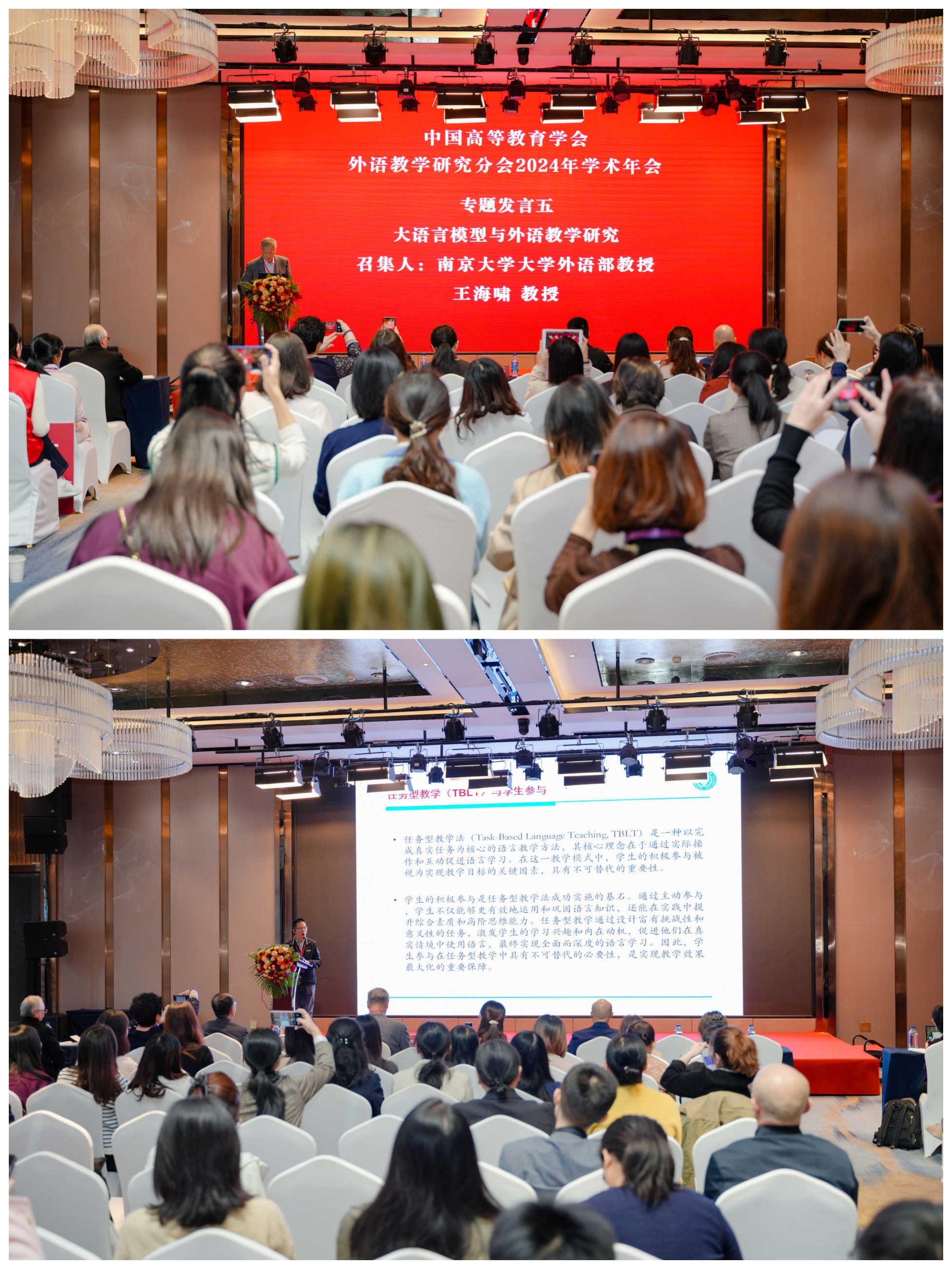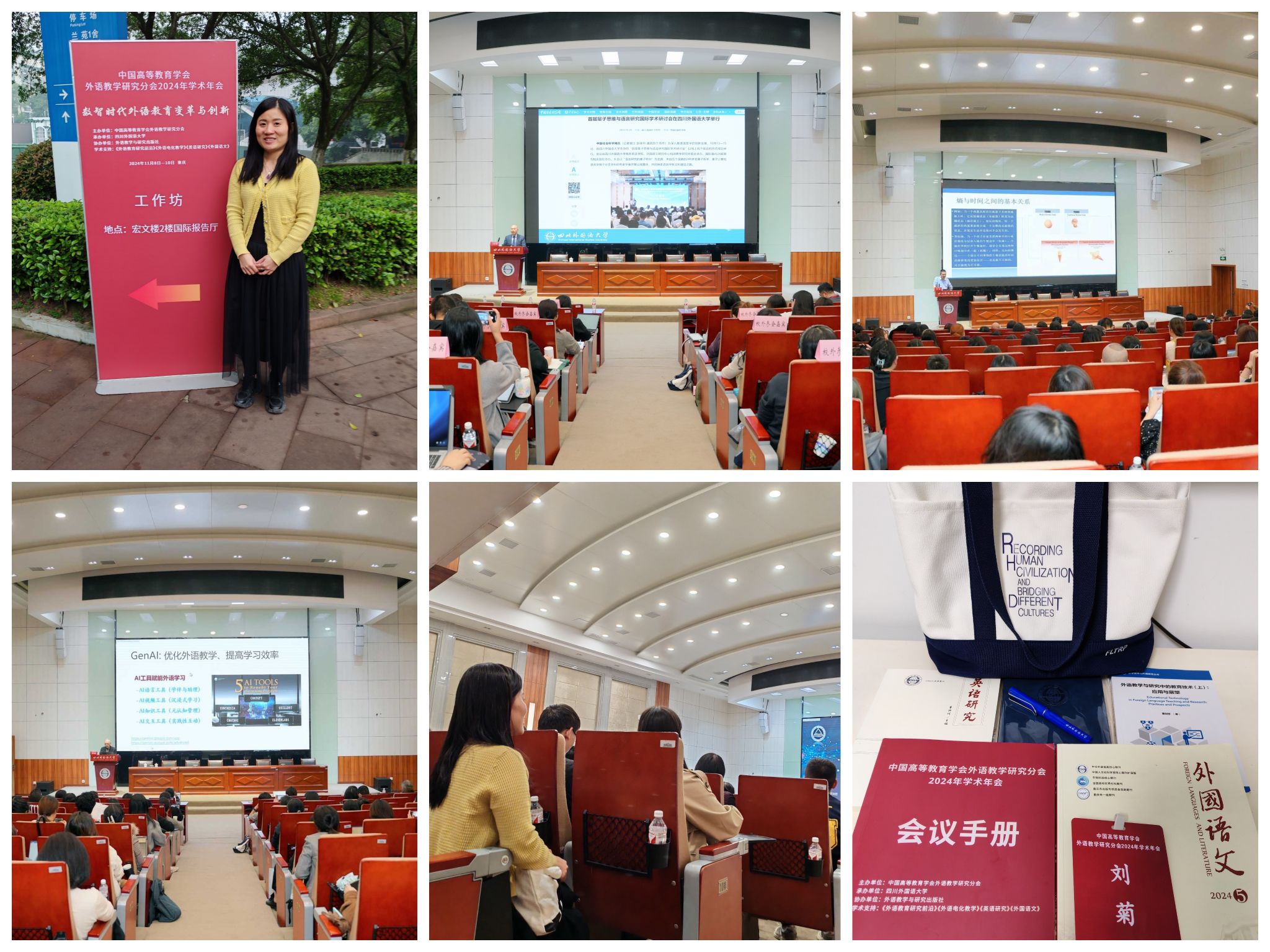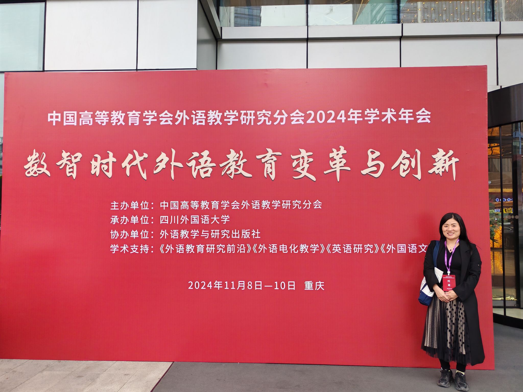 为深入贯彻落实党的二十大精神和 2024 年全国教育工作会议部署,以智能化赋能教育治理,引领教育变革与创新,中国高等教育学会外语教学研究分会于 2024 年 11 月 8 日—10 日在重庆举办2024 年学术年会,会议由中国高等教育学会外语教学研究分会主办,四川外国语大学承办,外语教学与研究出版社协办。中国高等教育学会、重庆市教育委员会相关领导和同志以及来自全国近200所高校的400余名代表参加了本次大会。我校外国语学院刘菊老师受邀参加本次学术年会,认真学习并在9日下午的分组发言中围绕“数智时代外语教育变革与创新”这一主题做了题为“大语言模型背景下外语教学与大学生数字素养发展研究”的论文宣读。