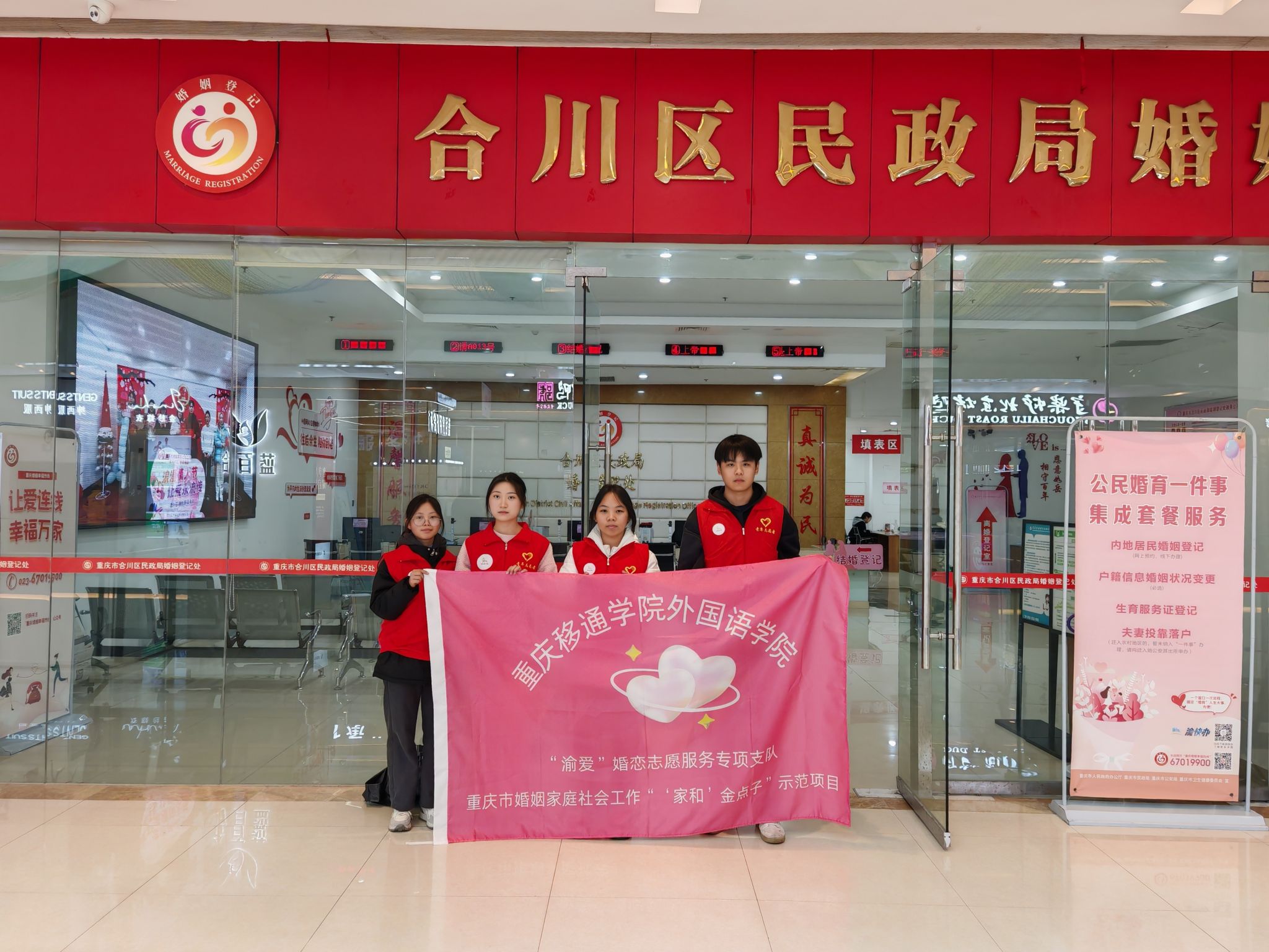 五月,阳光灿烂,爱意弥漫,恰逢“520”这充满希望与美好的日子,婚恋如同璀璨星辰,承载着人们对美满生活的向往。而志愿服务似温柔暖风,传递着关爱与力量。为助力新人迈向幸福婚姻旅程,弘扬和谐婚恋理念,重庆移通学院外国语学院青年志愿者协会 “渝爱” 婚恋志愿服务专项支队于5月21日在合川民政局开展一场别开生面的志愿活动,为新人们的爱情增添温暖与祝福。