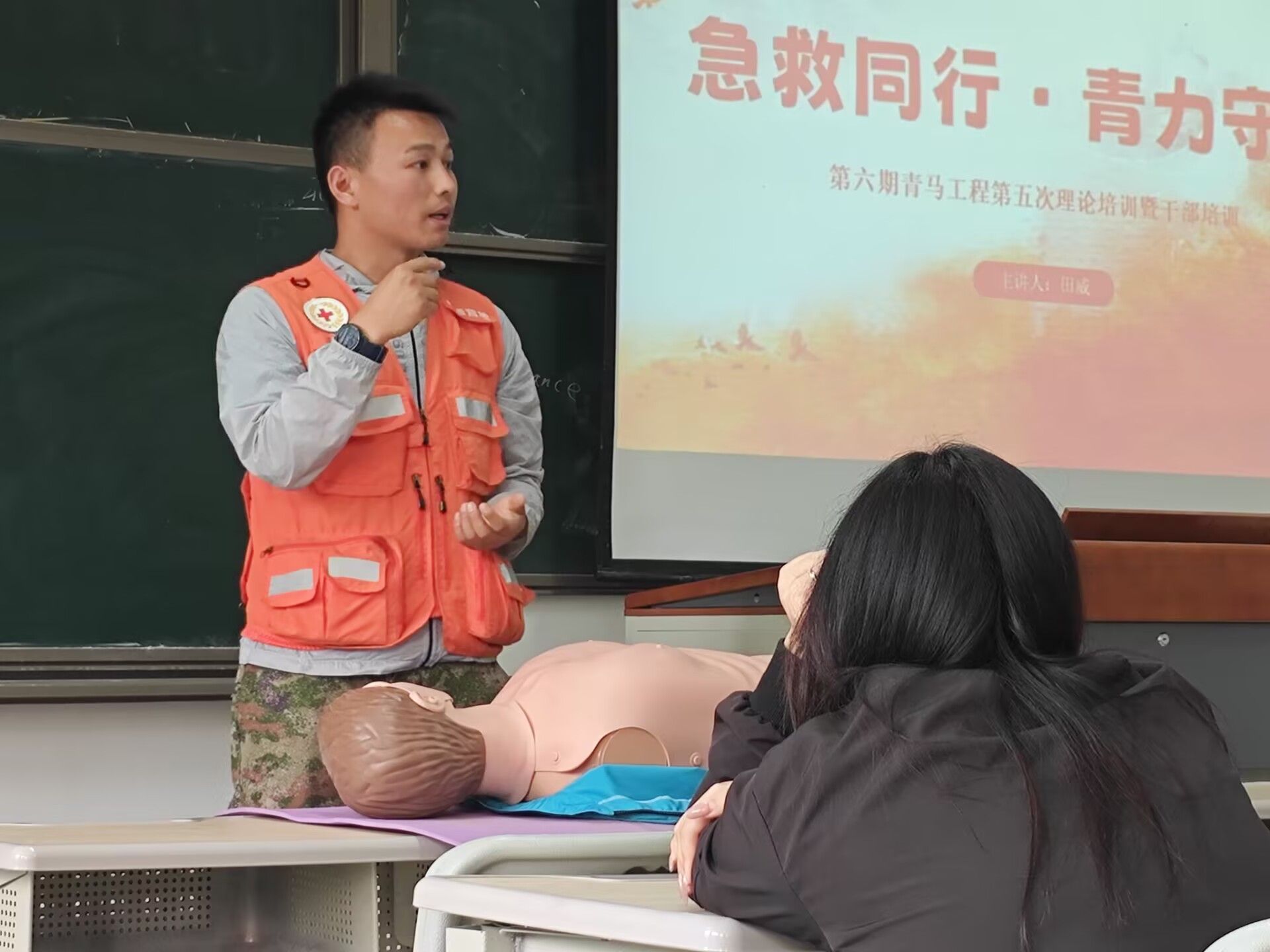 为强化青马学员的互助意识,让“生命至上”的理念融入校园文化,为平安校园建设筑牢“青春防线”。本次活动特邀田威讲师为我们讲解和培训急救技能,学习心肺复苏与海姆立克急救技能,既是提升个人综合素质的关键一课,更是践行责任担当的生动实践。本次培训于4月23日下午12:30,在第九教学楼9203教室开展。