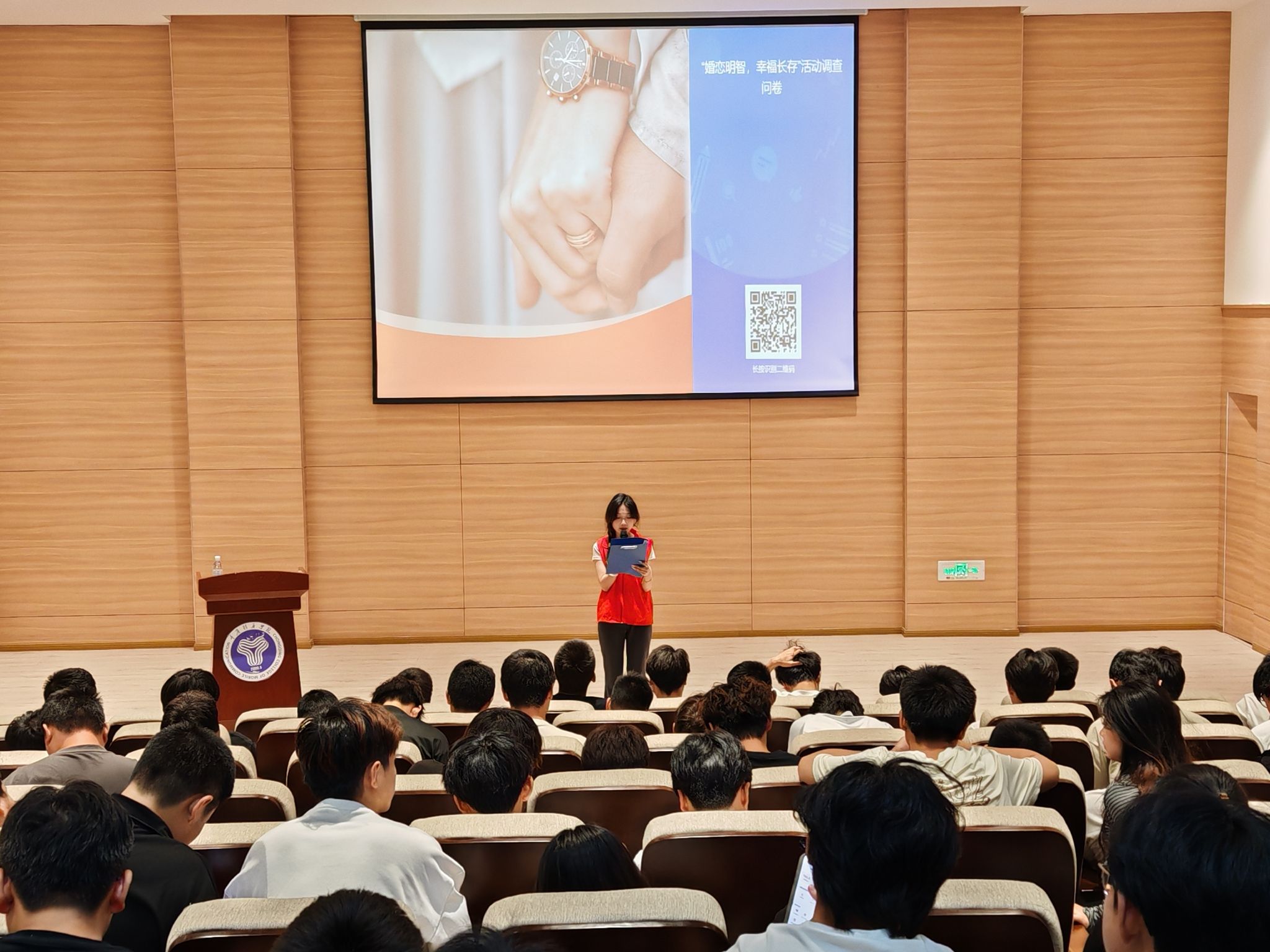 四月的校园春意盎然,生机勃勃,而当代大学生的婚恋观念也随着时代的浪潮悄然变化。面对“闪婚闪离”“物质至上”等社会现象带来的困惑与挑战,如何引导青年学子树立正确的婚恋观,成为社会关注的焦点。为此,重庆移通学院外国语学院青年志愿者协会于4月16日晚在六度空间举办一场主题为“大学生婚恋避雷指南与成长法则”的婚恋知识讲座,特邀合川民政局情感导师水卿梅担任主讲嘉宾,为学生带来一堂深刻而实用的婚恋教育课。智能工程学院心理专项岗负责老师谭英姿带领智工150余名学生积极参与到本次讲座。