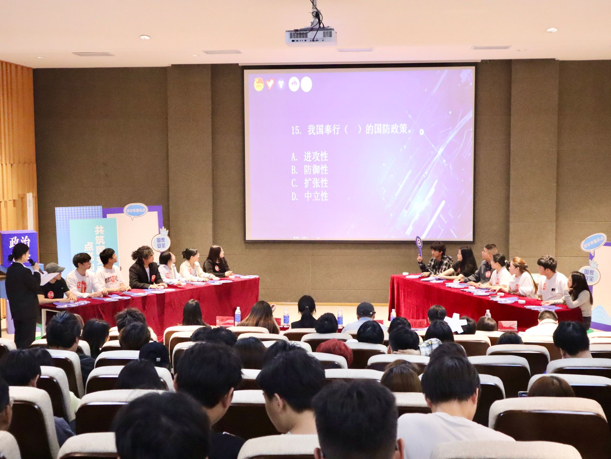 随着主持人宣布活动开始,正式进入“知识抢答抢答”环节。十四位参赛选手以笔为戈、以智为盾,展开"毫秒级"脑力角逐,选手们以扎实储备与敏捷思维诠释新时代青年的国安素养,思维的火花在迸发,现场瞬时凝结为无声战场