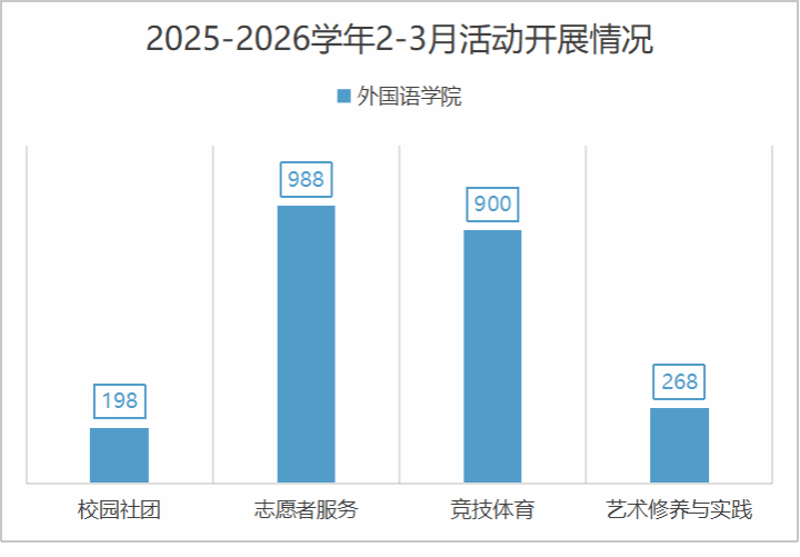 在外国语学院的完满教育活动中,志愿服务活动参与人数较多,有988人参加,校园社团参加人数为198人,竞技体育参加人数为900人,艺术修养与实践参与人数为268人。