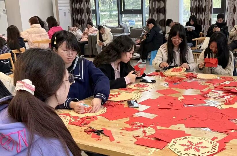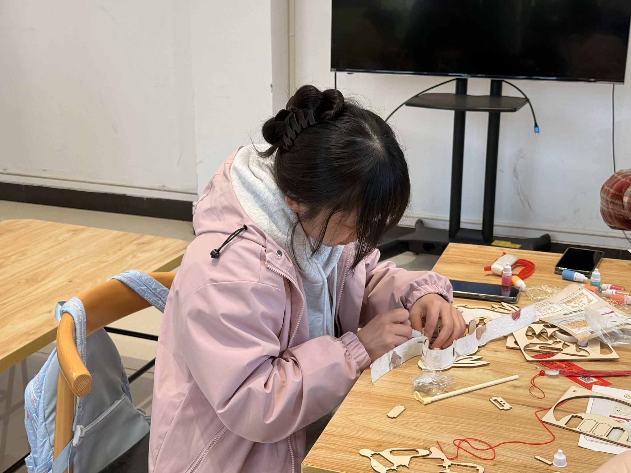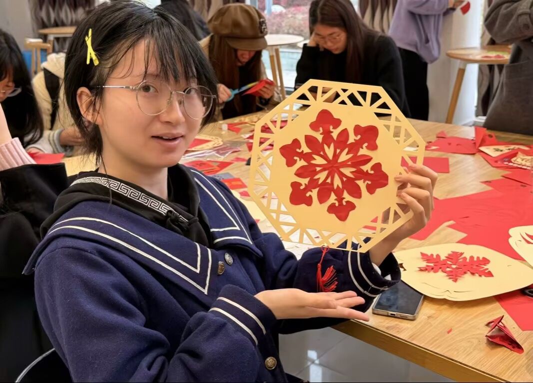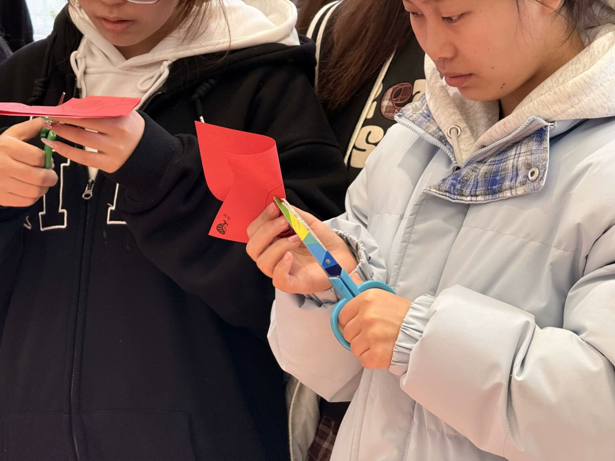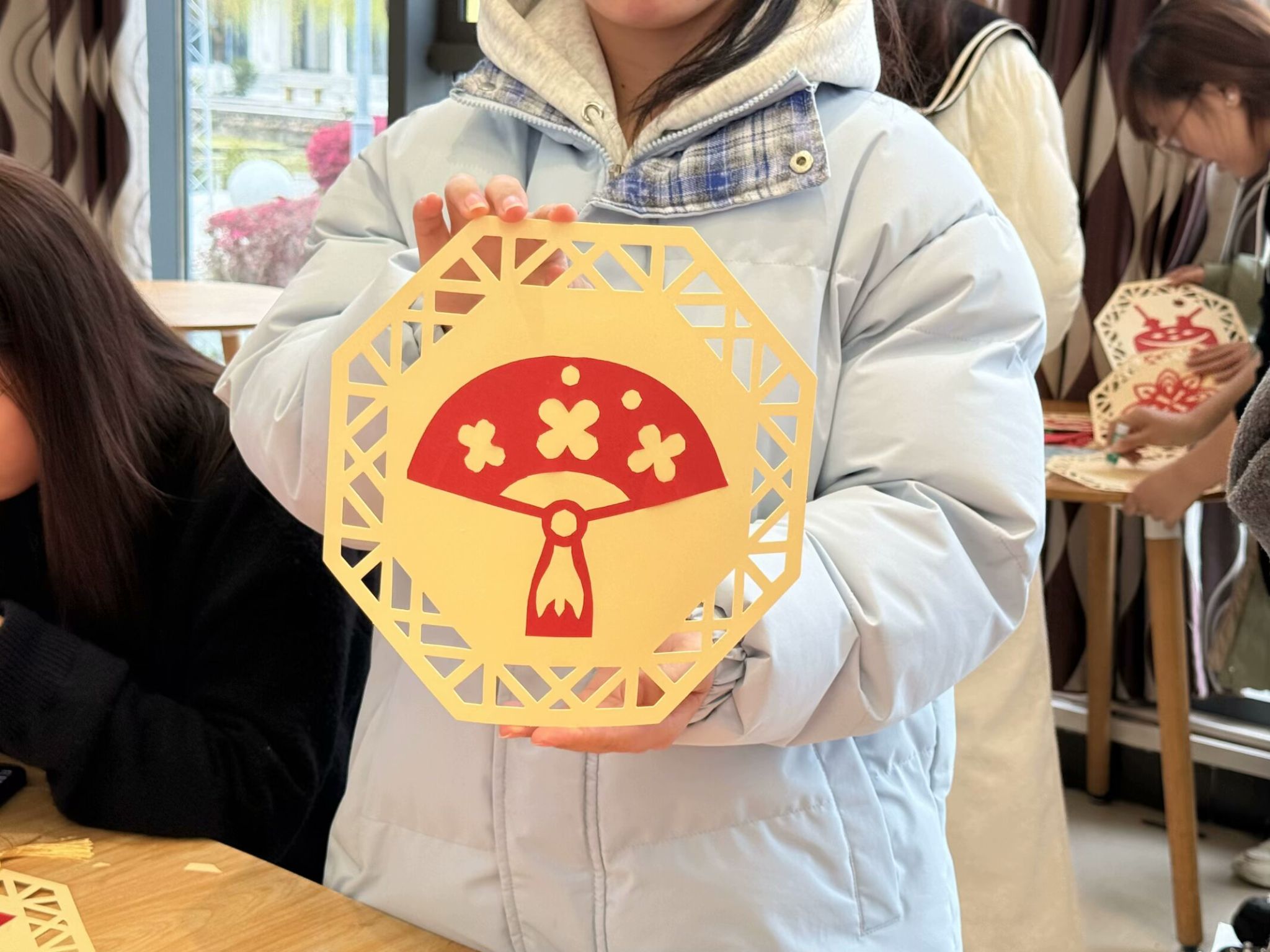 在热烈的氛围中,同学们分成若干小组,分别开展剪纸、漆扇、花草灯制作和纸鸢制作。在剪纸组,同学们手持剪刀,小心翼翼地将一张张红纸剪成形态各异的图案,有栩栩如生的动物,也有寓意吉祥的花卉;漆扇组则专注于在扇面上绘制精美的图案,用细腻的笔触和鲜艳的色彩展现漆扇的独特韵味;花草灯制作组的同学们巧妙地将干花、野草等自然元素融入灯具制作,一盏盏充满自然气息的花草灯在他们手中诞生;纸鸢制作组的同学们则充分发挥创意,在风筝上绘制各种图案,为传统纸鸢增添了现代活力。