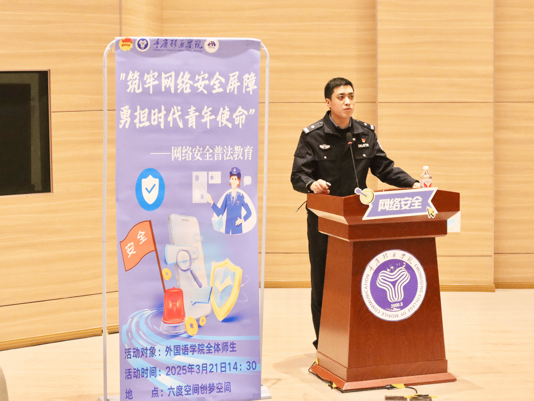 在数字化浪潮席卷的当下,网络深度融入生活,带来便捷与活力的同时,网络安全问题也愈发突出。为提升青年学生网络安全意识,重庆移通学院外国语学院于2025年3月21日14:30在六度空间·创梦空间举办了“灯塔计划第一期辅导员讲党课——筑牢网络安全屏障,勇担时代青年使命”活动,通过多元形式激发青年学子守护网络安全的使命感。