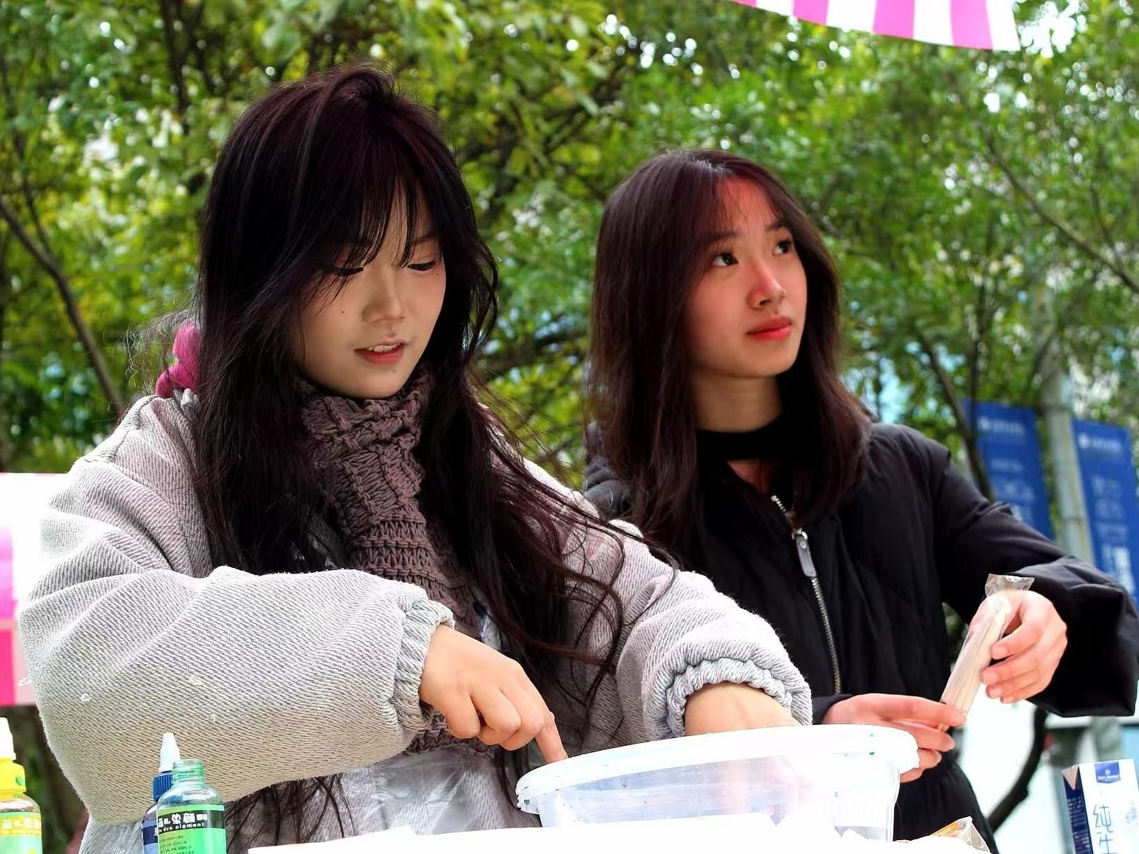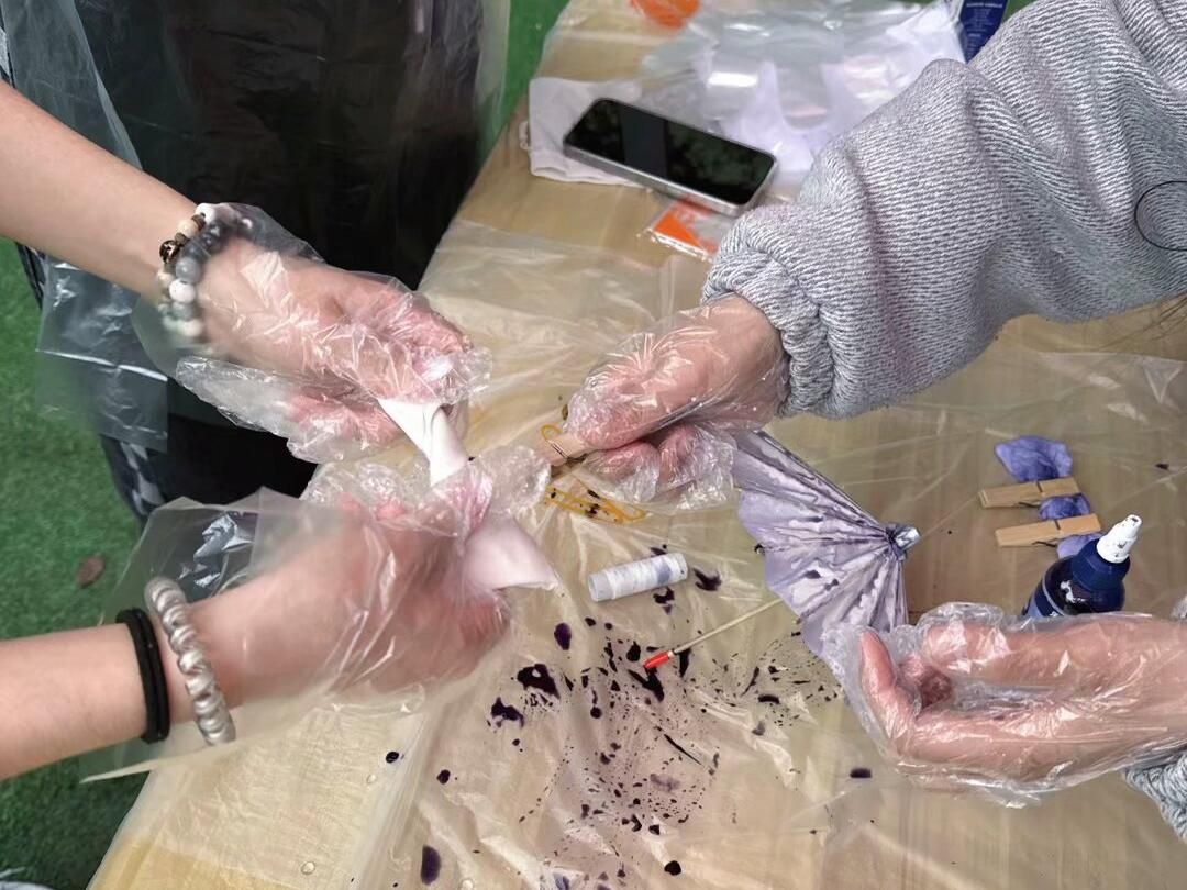 在实践环节,怀揣着对传统技艺的热忱,同学们纷纷化身“匠人”,全身心投入到扎染创作中。他们手持素白棉布,运用折叠、缠绕、打结等技巧精心固定,借助皮筋、木夹等工具巧妙塑形,赋予布料独特的雏形。当布料缓缓浸入天然靛蓝染缸,一场奇妙的氧化反应悄然上演,原本平淡的布料先是染上一层清新的绿意,转瞬之间,绿意如同被蓝色潮水席卷,迅速转变成深邃的蓝,且晕染效果层层递进,恰似水墨在宣纸上自由地肆意绽放。拆开扎结后,冰裂纹、螺旋纹、云纹等精美图案瞬间呈现,由于每位同学手法不同,每一幅作品都成了世间独一无二的“孤品” 。活动现场惊叹声此起彼伏,处处洋溢着对传统扎染工艺的惊叹与赞美。