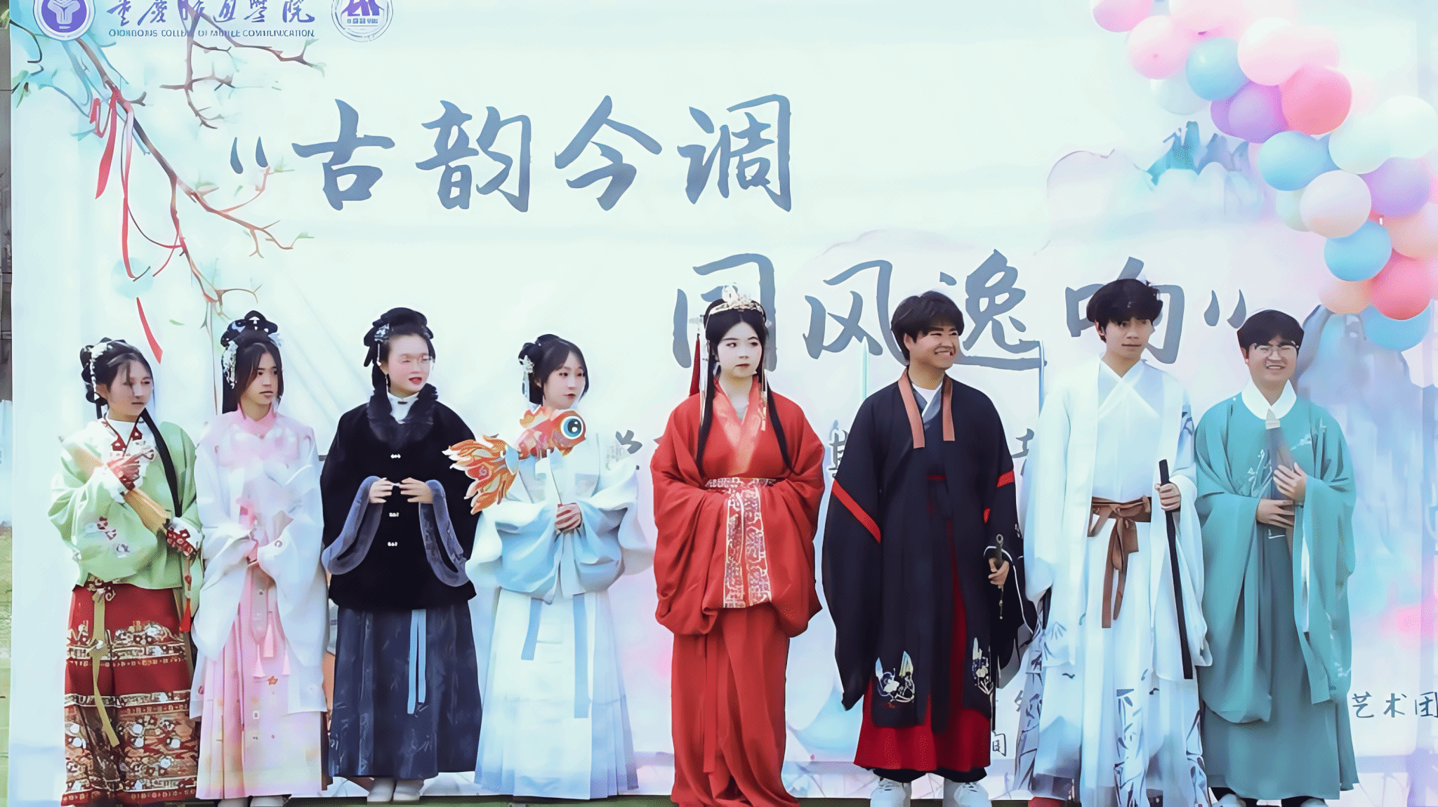 在同学们还在对婉转动听的国风旋律流连忘返之时,活动已经来到了中场环节,华韵汉服协会携数套历代传统服饰惊艳登场。从秦汉曲裾的庄重大气,到唐宋齐胸襦裙的飘逸灵动,再到明代马面裙的华贵典雅。社员们手持团扇、长剑,踏着轻快的背景音乐旋律款款而行。衣袂翻飞间,簪花、璎珞、禁步等配饰泠泠作响,为同学们带来了一场跨越古今的国风视觉盛宴。