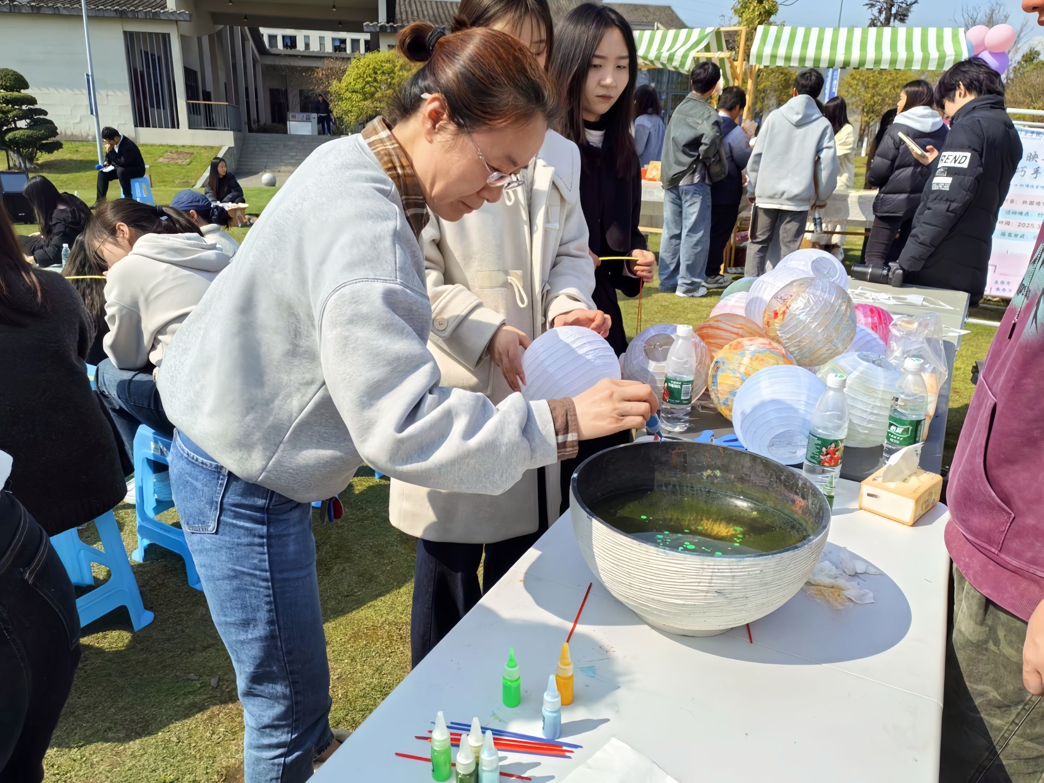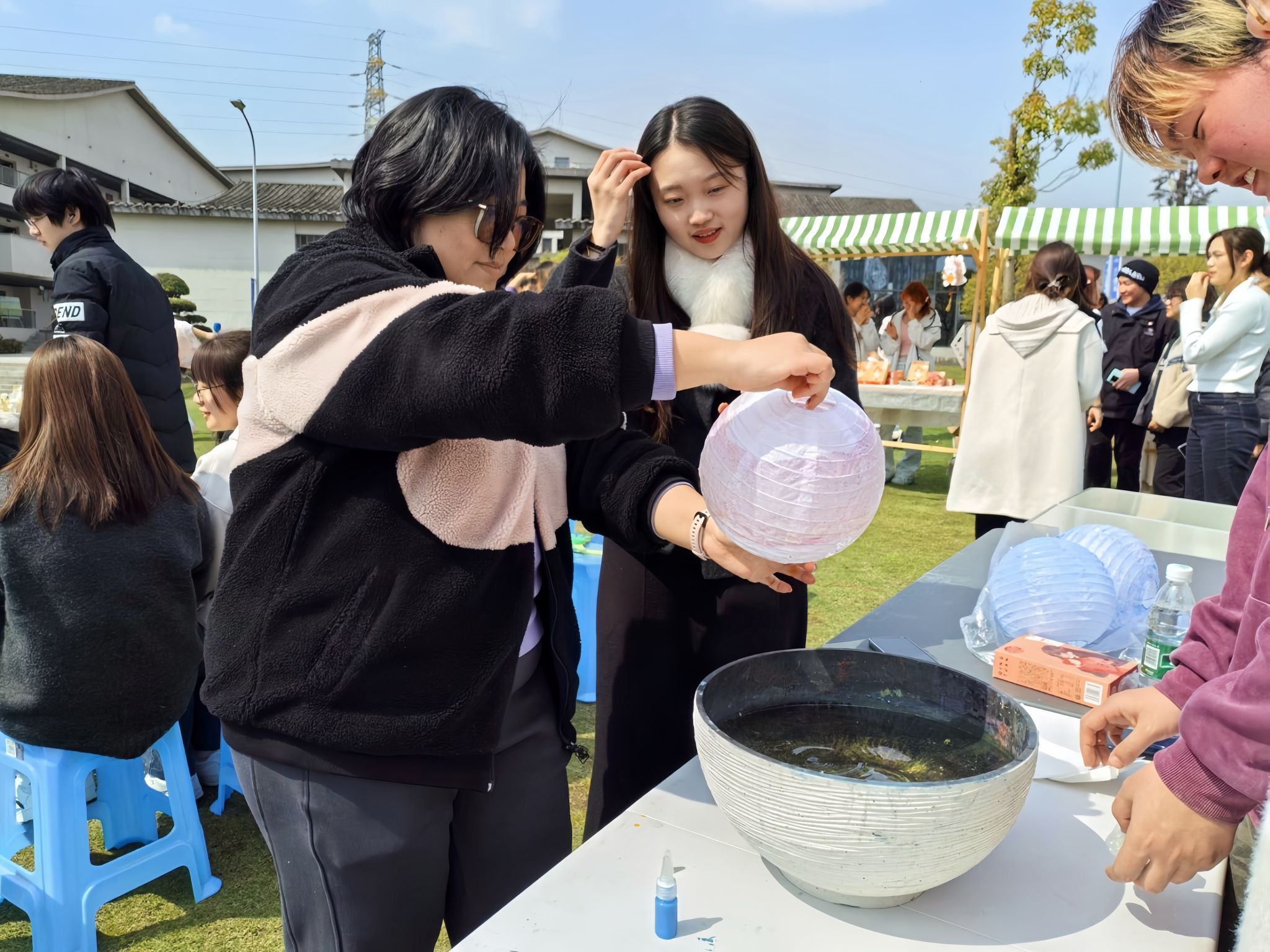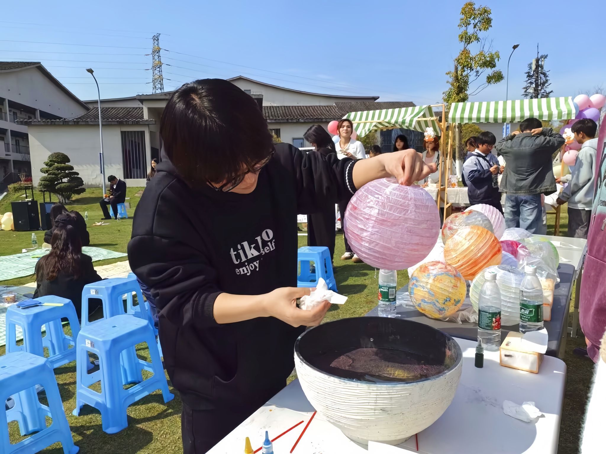 在这春日的暖阳下,草坪的另一边还安排了灯笼漂漆活动。同学们聚在染缸旁,手握着一只只尚未绽放缤纷色彩的糊纸灯笼,这些糊纸灯笼以纤细的竹篾为骨,洁白的棉纸为衣,散发着淡雅的气息。在明媚阳光的映照下,染缸中的漂漆闪烁着神秘而迷人的光泽。同学们小心翼翼地将自己制作的灯笼浸入染缸,随着灯笼缓缓沉下,漂漆如绽放的花朵般逐渐将其包裹,晕染出绚丽的色彩。春风轻拂,带着花香与墨香交织的气息,展现出中华传统文化的无尽魅力。