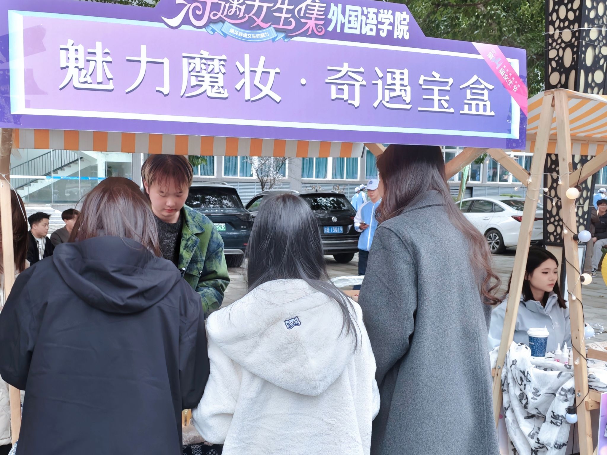 “她走在美的光彩中,如夜晚皎洁无云而且繁星满天。”女性是熠熠生辉的存在,用善良与勇气、智慧与力量,书写着独一无二的人生篇章。为全面活跃同学们校园文化生活,丰富同学们的精神世界,更好的展现当代女大学生的青春靓丽、积极向上之风采;让大家能够积极地参与活动,有更多自信去表达自我、展示自我,促进同学间真挚交流,发现自身美好与独特,收获惊喜与感动。外国语学院青年志愿者协会安心志愿服务支队于3月7日和权益部一起在黄桷树广场共同开启一场展现女性美好的集市摊位活动,充分融入女生节这一热闹氛围。