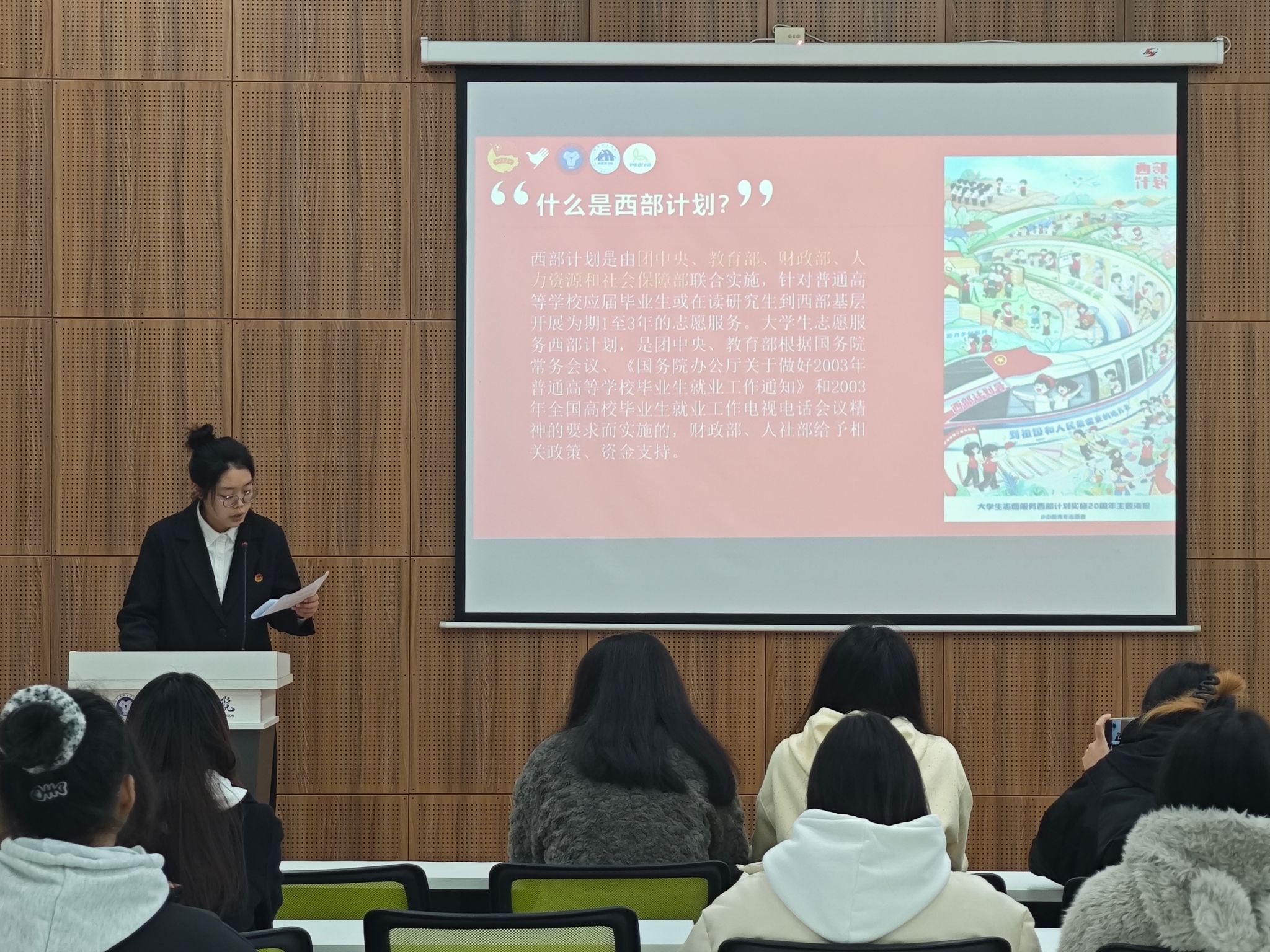 西部计划,宛如一颗闪耀在祖国广袤西部大地上的希望之星,承载着无数青年的热血梦想与时代使命。为积极响应国家号召,大力推动西部计划在校园中的深入开展,让更多有志青年投身西部建设的伟大事业,重庆移通学院外国语学院于2024年12月26日,在天渠111举办以“闪耀青春·逐“西”前行”为主题的2025-2026年度西部计划招募宣传系列活动。