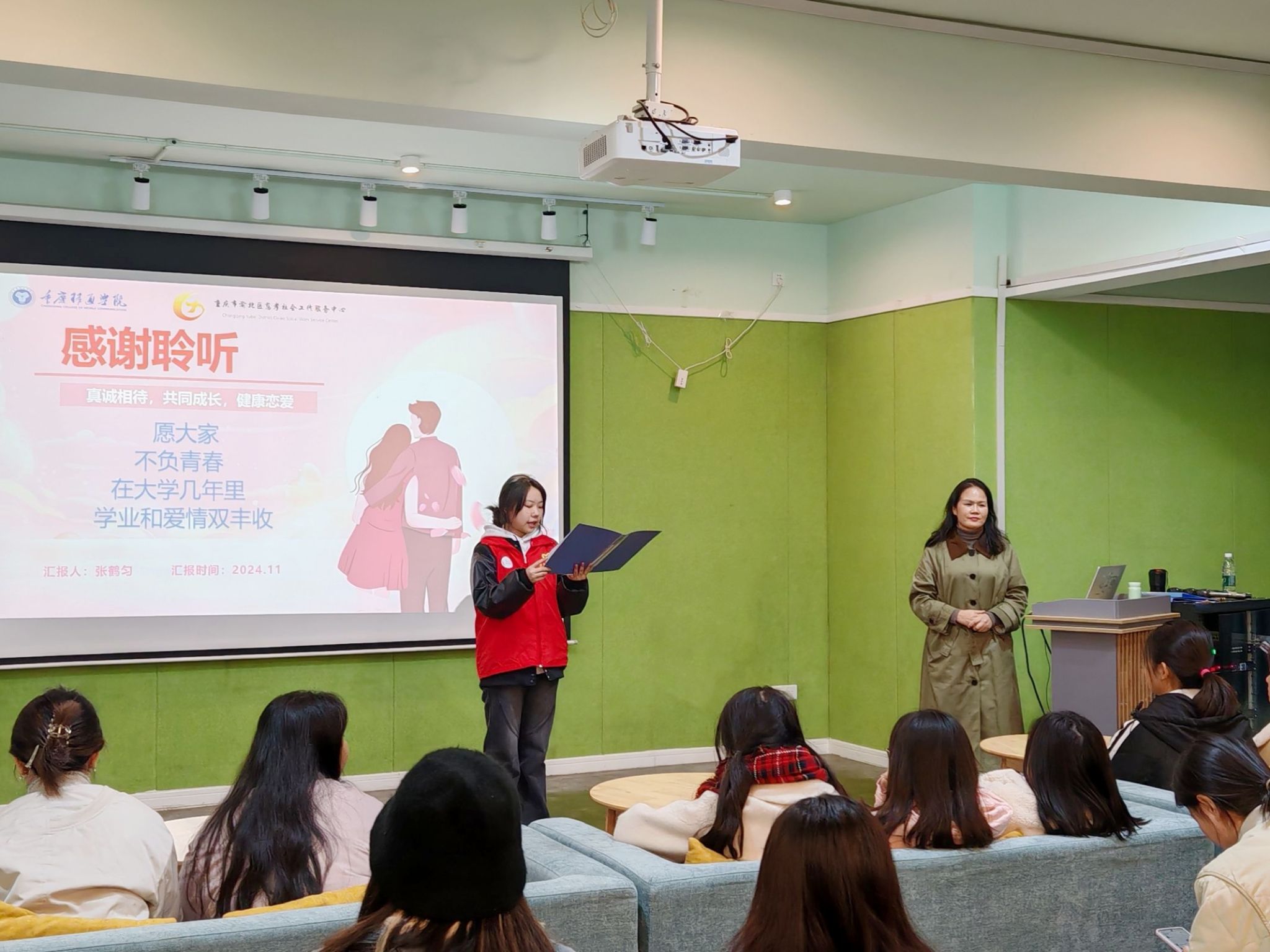 在当今社会,大学生活社交圈不断拓展,信息呈爆炸式蔓延,恋爱问题已然成为大学生群体关注的核心焦点。为助力大学生树立正确恋爱观、提升恋爱技巧、增强情感沟通能力,外国语学院“渝爱”婚恋志愿服务专项支队于2024年11月20日下午,在双栀多功能影音室举办主题为“青春恋爱,爱的导航”的讲座。此次讲座有幸邀请到合川民政局情感导师张鹤云老师担任嘉宾,为同学们在恋爱情感问题的处理上指点迷津。