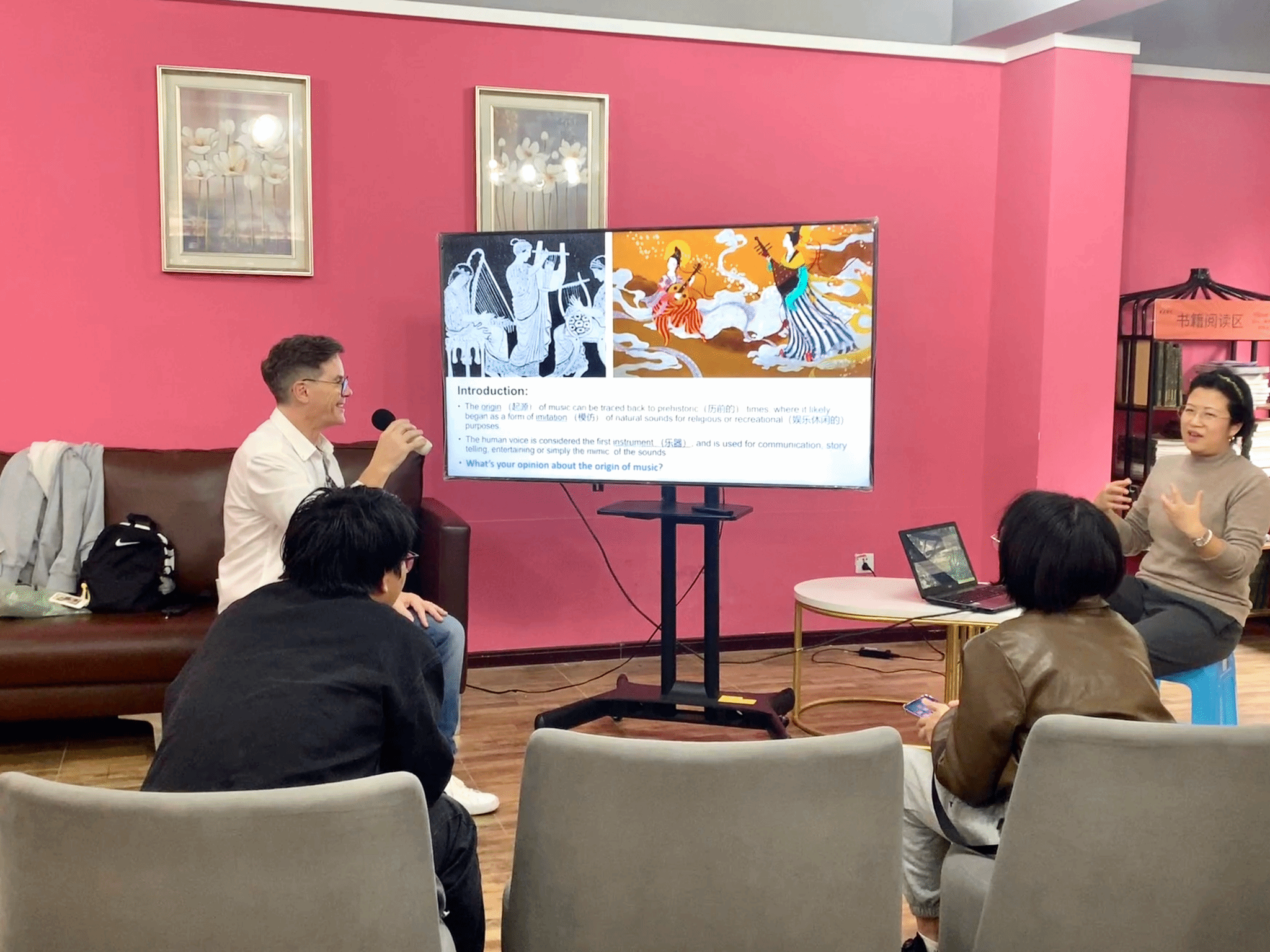 分享之外,为了更加带动同学们的情绪,杨沁霏老师分享了自己喜爱的音乐并且组织大家进行合唱。同学们伴随着一个个音符,一段段旋律,大家齐声歌唱。《Row, Row, Row Your Boat》虽是一首儿歌,但作为合唱前的热身曲目,其欢快轻松的旋律,让大家立刻放松下来; 旋律悠然,大家不禁随音乐摆动,不亦乐乎。动听的歌声充满了整个房间,大家共同享受着音乐带来的快乐;那一刻是一群人的情绪共振。立冬过后,温度渐低,冬天的气氛越来越浓厚,大家合唱一首 George Michael的《Last Christmas》,节奏欢快,画面温馨,为初冬增加了几分暖意。