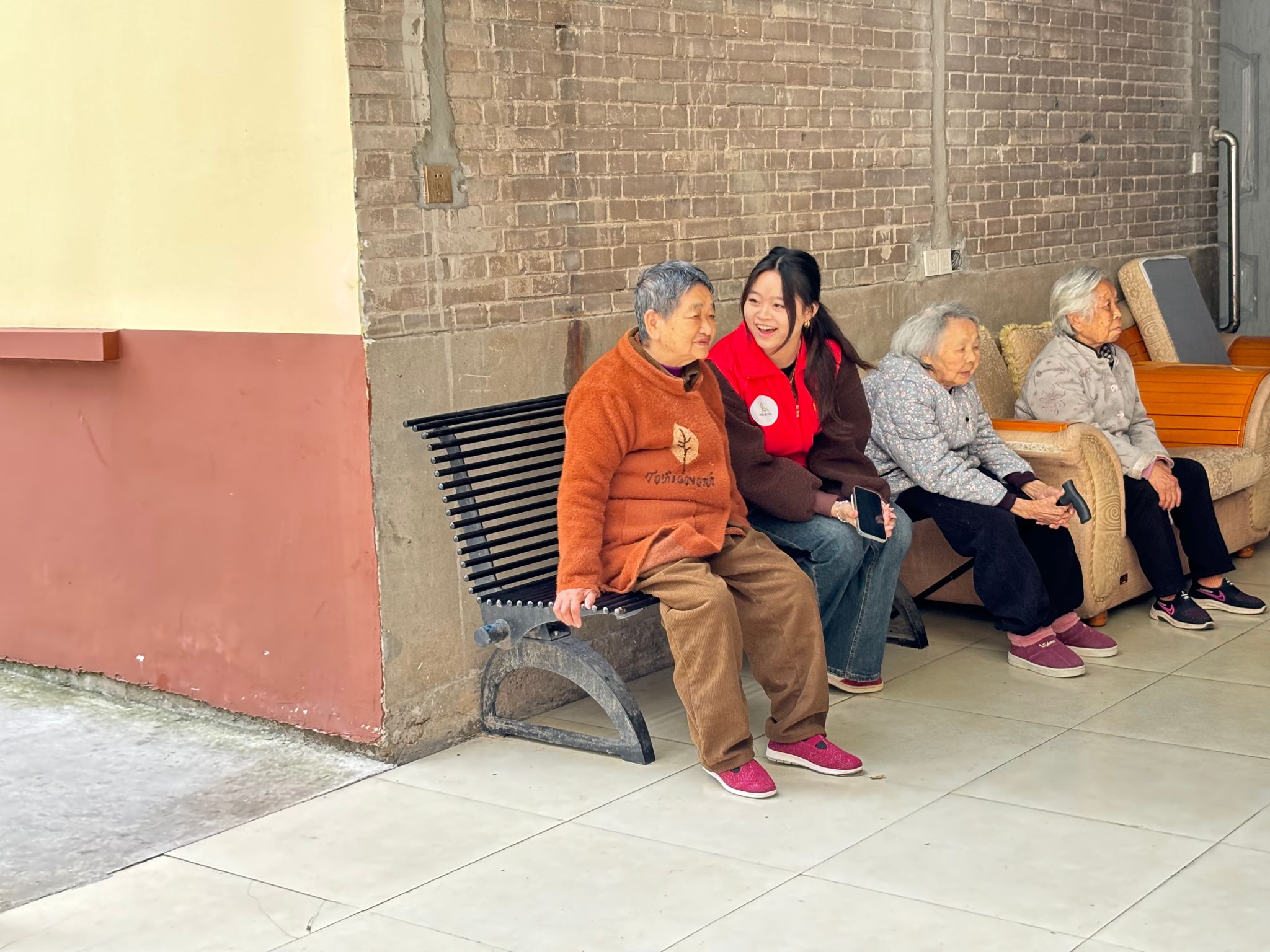 志愿者怀着满腔热情,纷纷围坐在耄耋之年的长者周围,与之亲切地交谈着日常生活的话题。“天冷注意添衣”,似乎寒冷的立冬更能牵扯出爱的关怀。在老人们细细的谈吐中,丰富多样的故事仿佛一幅幅多彩的画卷展开在志愿者们的眼前,使之领略到时代的进步与发展。欢声笑语围绕在这个养老小院,交谈中流露出的温馨驱散冬日严寒的侵袭。