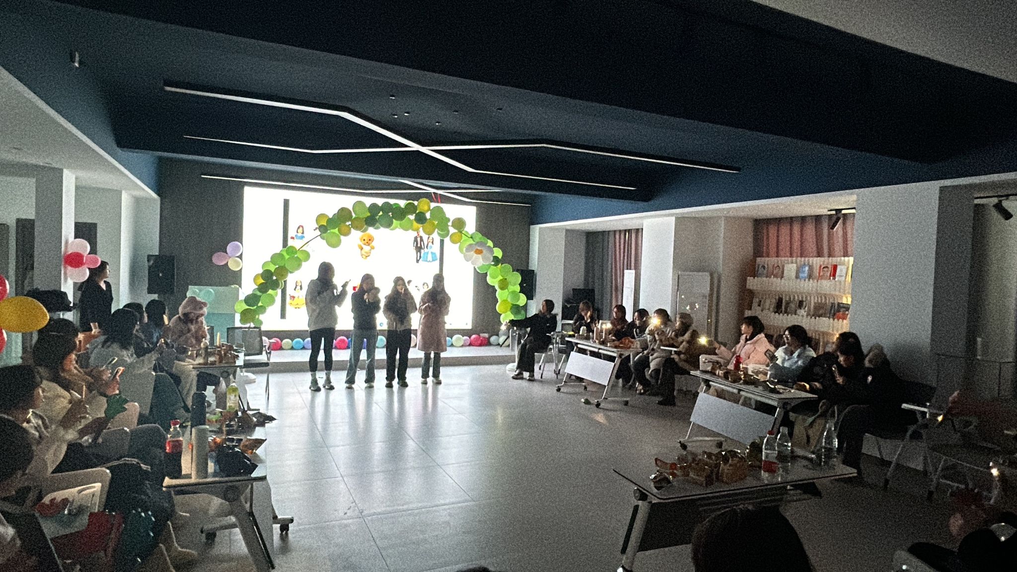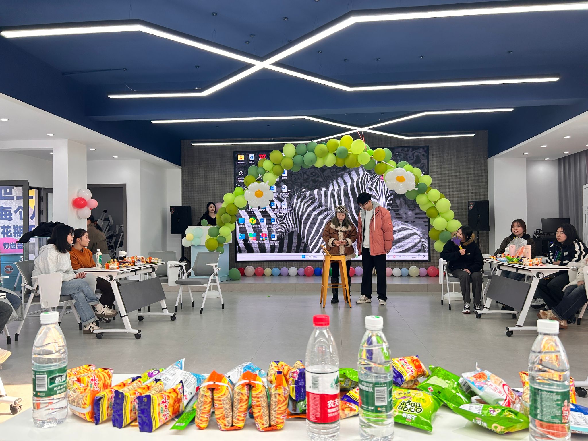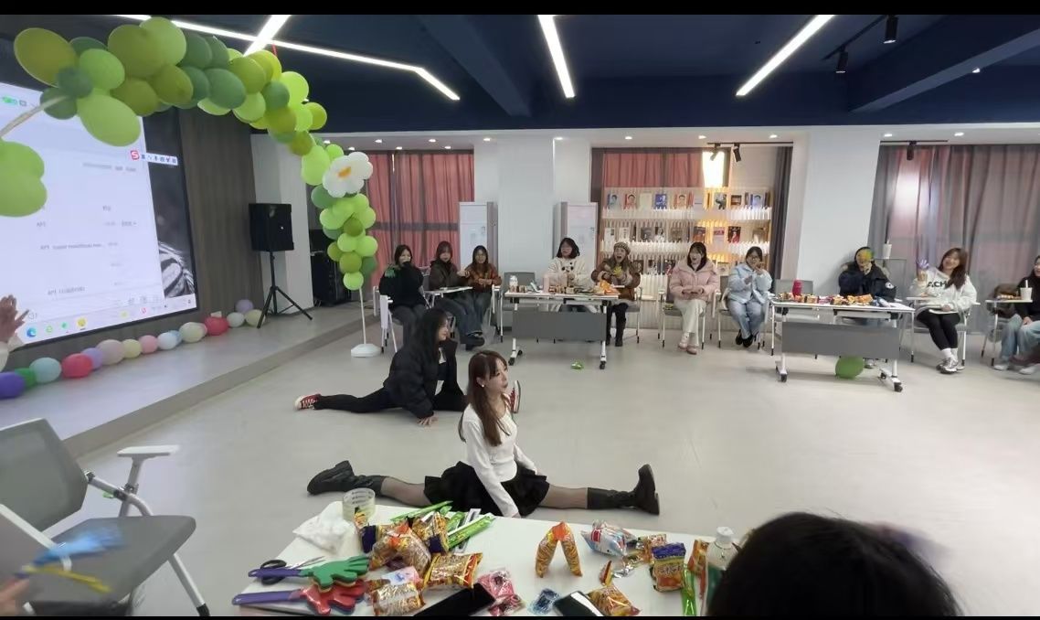 在经过了各小组的才艺表演后,为了促进同学间相互认识以及对校园环境的熟悉,开始了以小组为主的名字接龙游戏,在游戏过程中大家协同合作,纷纷以满腔热情的状态去积极与平时不熟悉的同学相互认识,促进了同学间的合作与交流。随后导员也同大家一起进行了击鼓传花你问我答的游戏,在接受惩罚的阶段,支部成员们都采取互相组队上台表演才艺的方式接受了惩罚,接受惩罚的同学在台上大胆展示自己的兴趣爱好,赢得了台下一片呼声。
