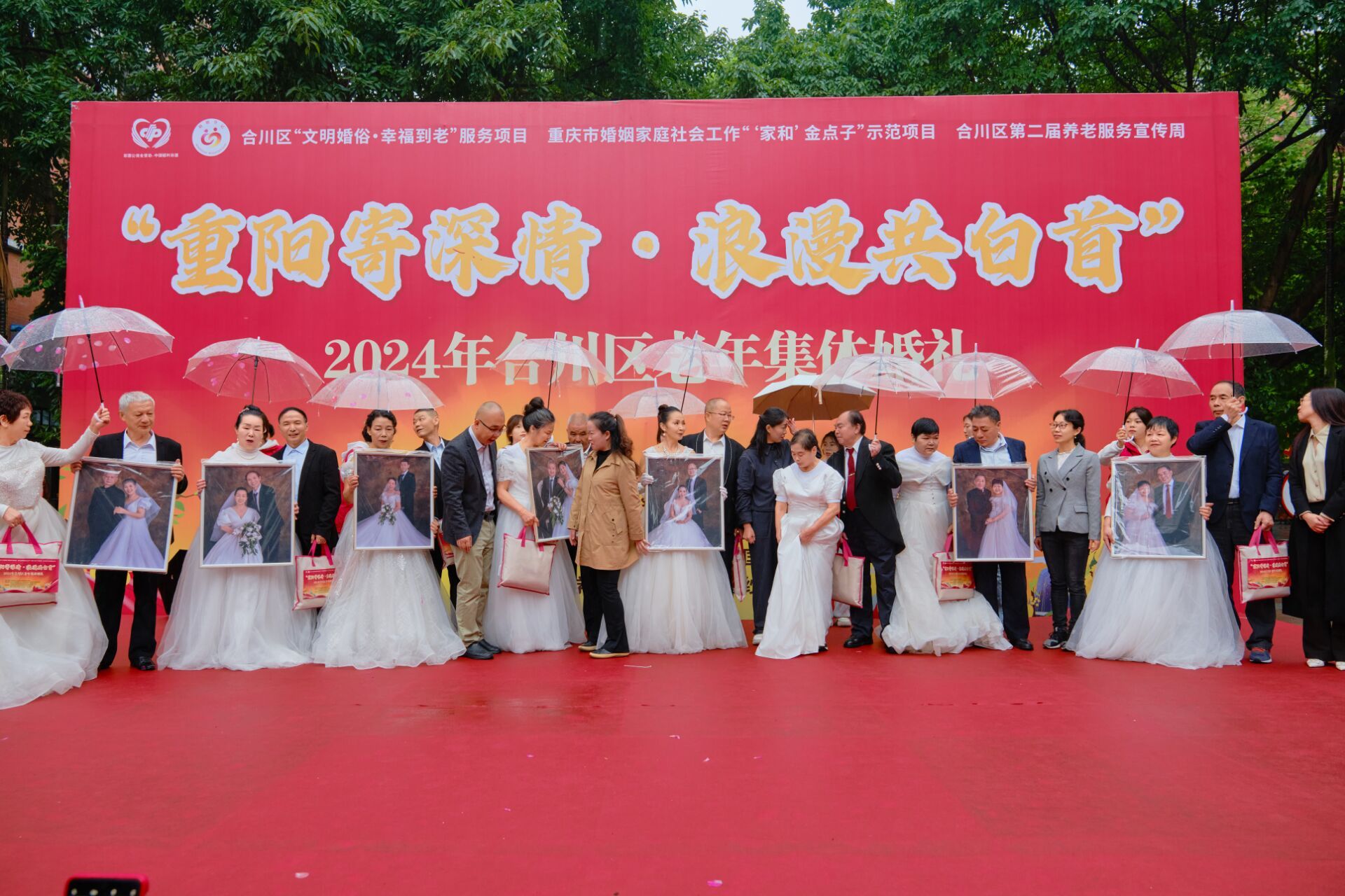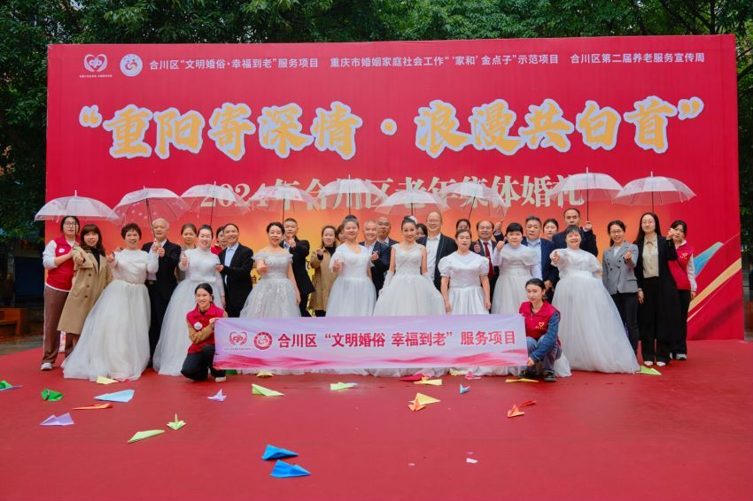 在传承与发扬优秀传统文化的征程中,新时代的青年肩负着重大责任,尤其是在引导青年践行孝老爱亲的优秀家庭美德、崇尚婚俗新风方面,更是义不容辞。展现当代社会“文明婚俗,幸福到老”的新时代婚姻家庭理念,是当代青年的神圣使命。10月11日,重庆移通学院外国语学院青年志愿者协会“渝爱”婚恋志愿服务专项支队前往合川区久长街广场,参与由重庆市合川区民政局,重庆市合川区妇联,重庆市合川区养老服务协会,重庆市合川区钓鱼城街道,重庆市合川区民政局婚姻登记处,重庆市渝北区慈孝社会工作服务中心,重庆移通学院外国语学院,久长街社区,鼓楼街社区等单位共同承办与支持的“重阳寄深情,浪漫共白首”合川区老年集体婚礼活动。