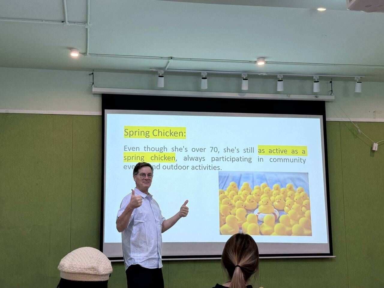 活动结束前,英国教师Jonathan Bodfish 带领大家学习了一些和“青春”及“气候”有关的俚语,并让同学们现场造句。当同学们了解到spring chicken 的意思时,明白了理解文化和思维方式的差异对于学好语言的重要性。