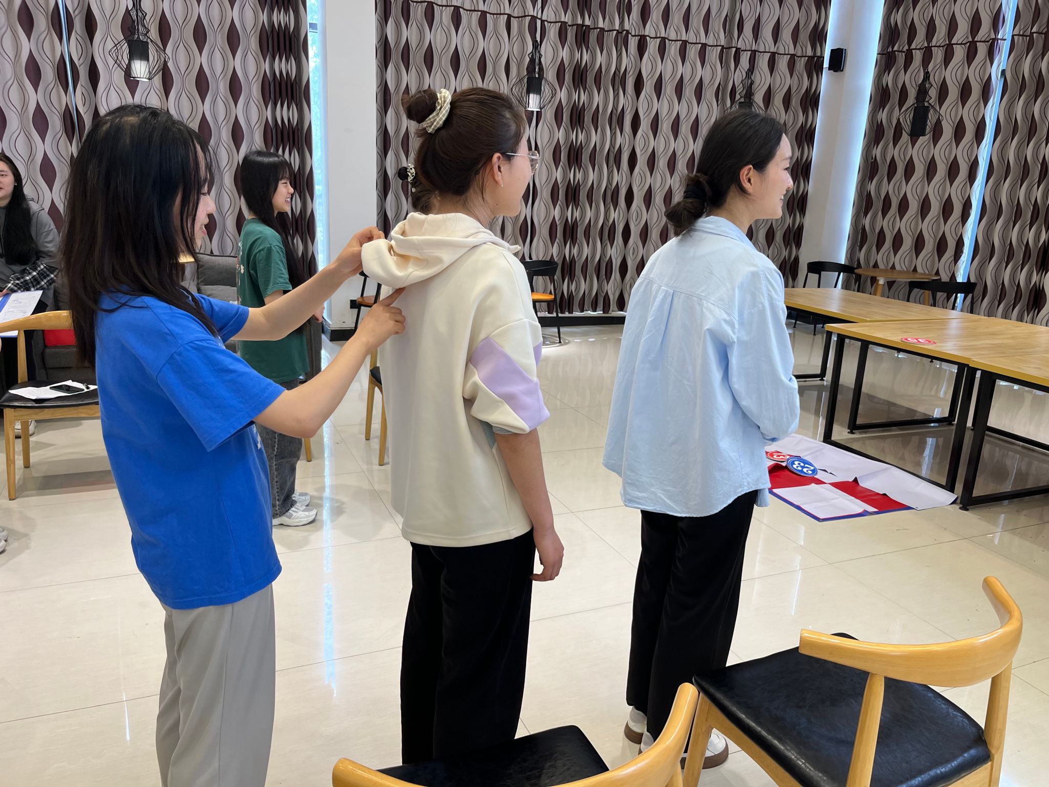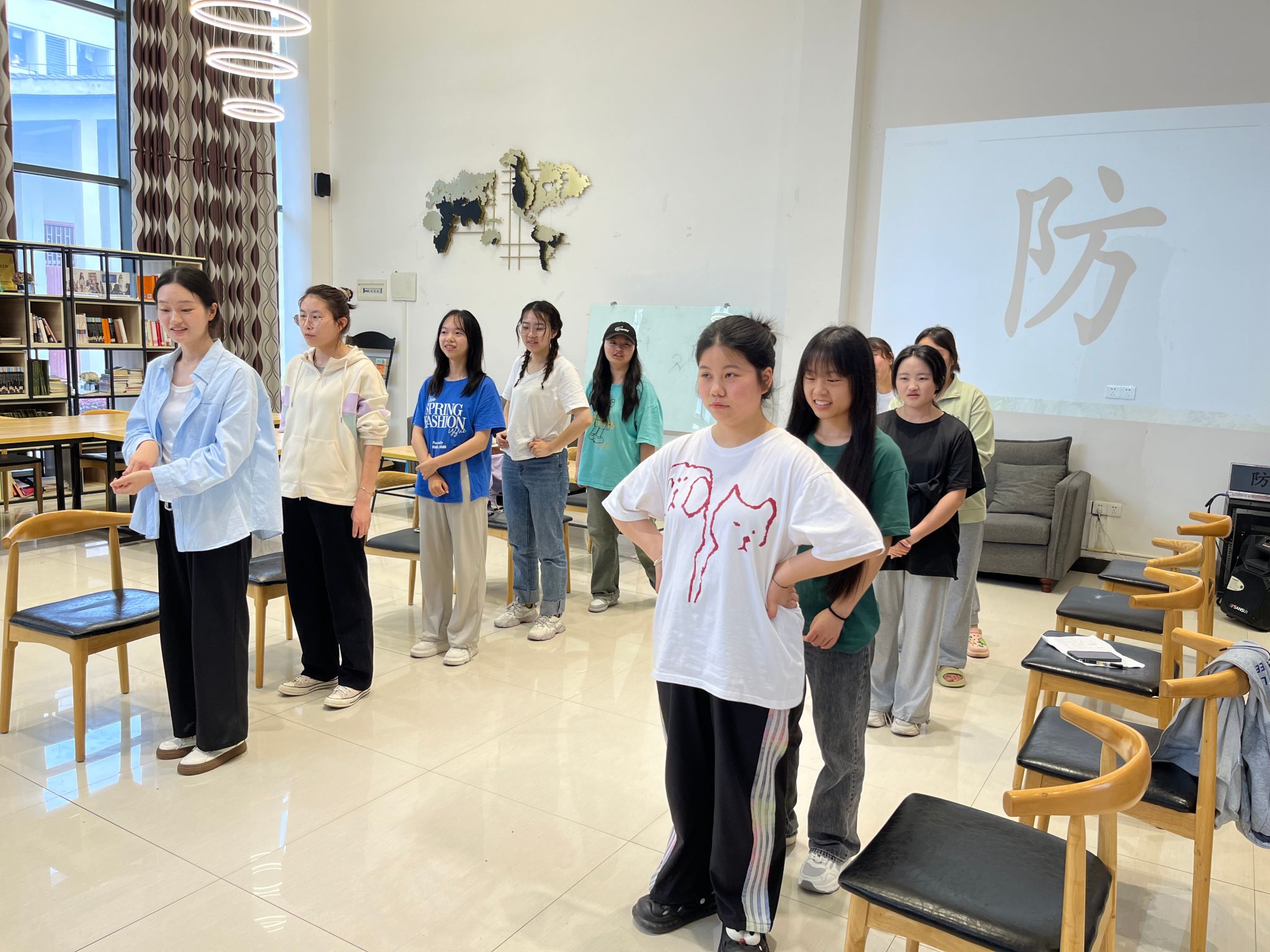 游戏迅速进行到本活动的最后环节——背后传字,各队队员按纵队整齐列阵,静待挑战。工作人员手持写有字词的卡片,展示给每组最后一人,后位同学以指尖为笔,在前一位队员背上一笔一划地“书写”。经过七轮激烈的比拼,最终获胜组角逐而出。他们用自己的行动诠释着阅读的力量,展现出当代学子的风采和担当,以及卓越的团队协作精神与灵活的思维转换能力。