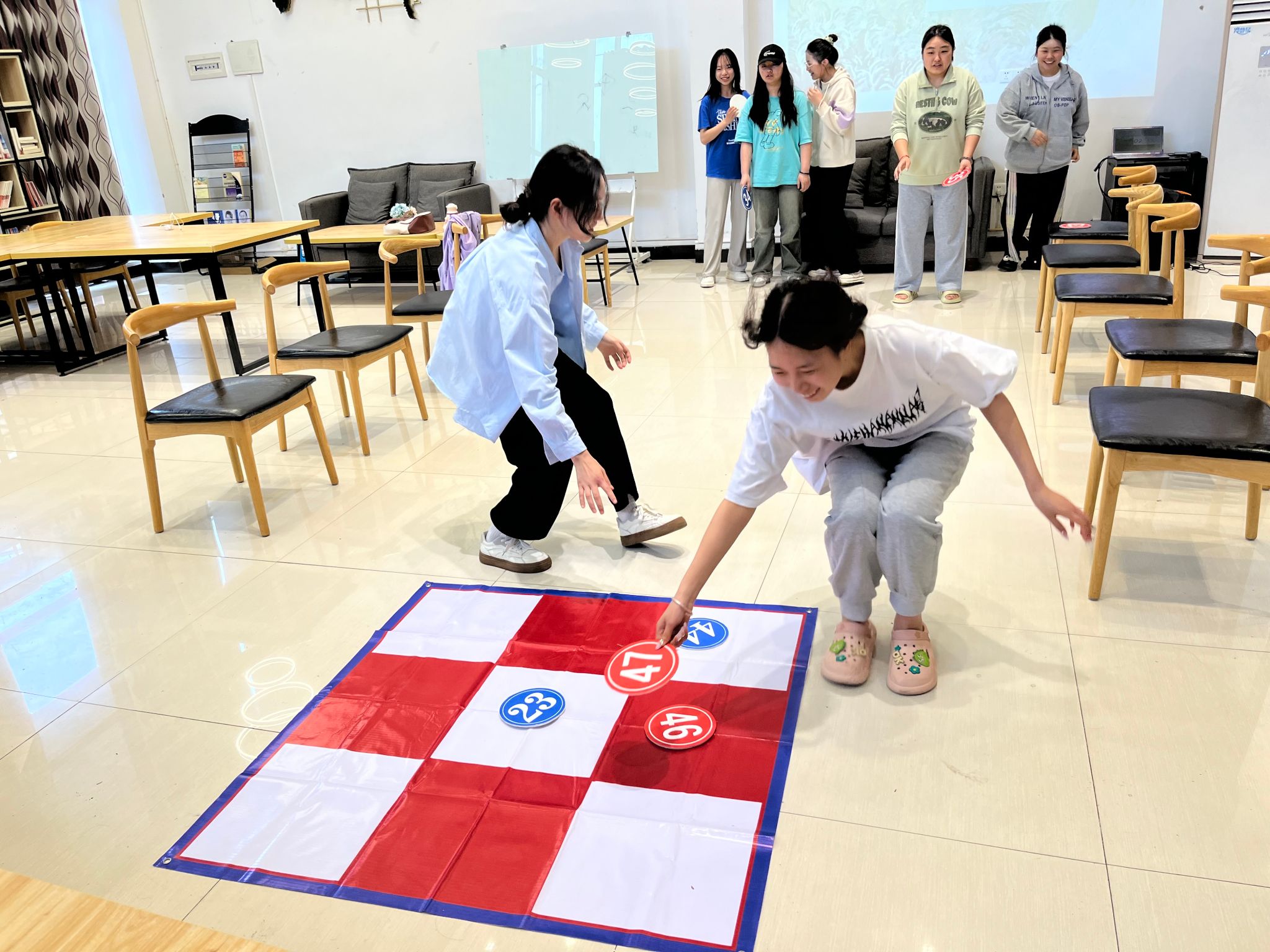 其次进行的是“极速三子棋”,此环节极其考验同学们的反应速度和智慧。比赛现场十分激烈,双方队员按照顺序,以矫健的步伐从起点奔向中央棋盘,并迅速将手中的棋子精准放入方格中,以便将三个棋子连成一条直线,获得闯关贴纸。这是一场智慧与速度的激情碰撞,同学们踊跃上场,为自己的队伍赢得荣誉,展现出同学们斗志昂扬的精神面貌。