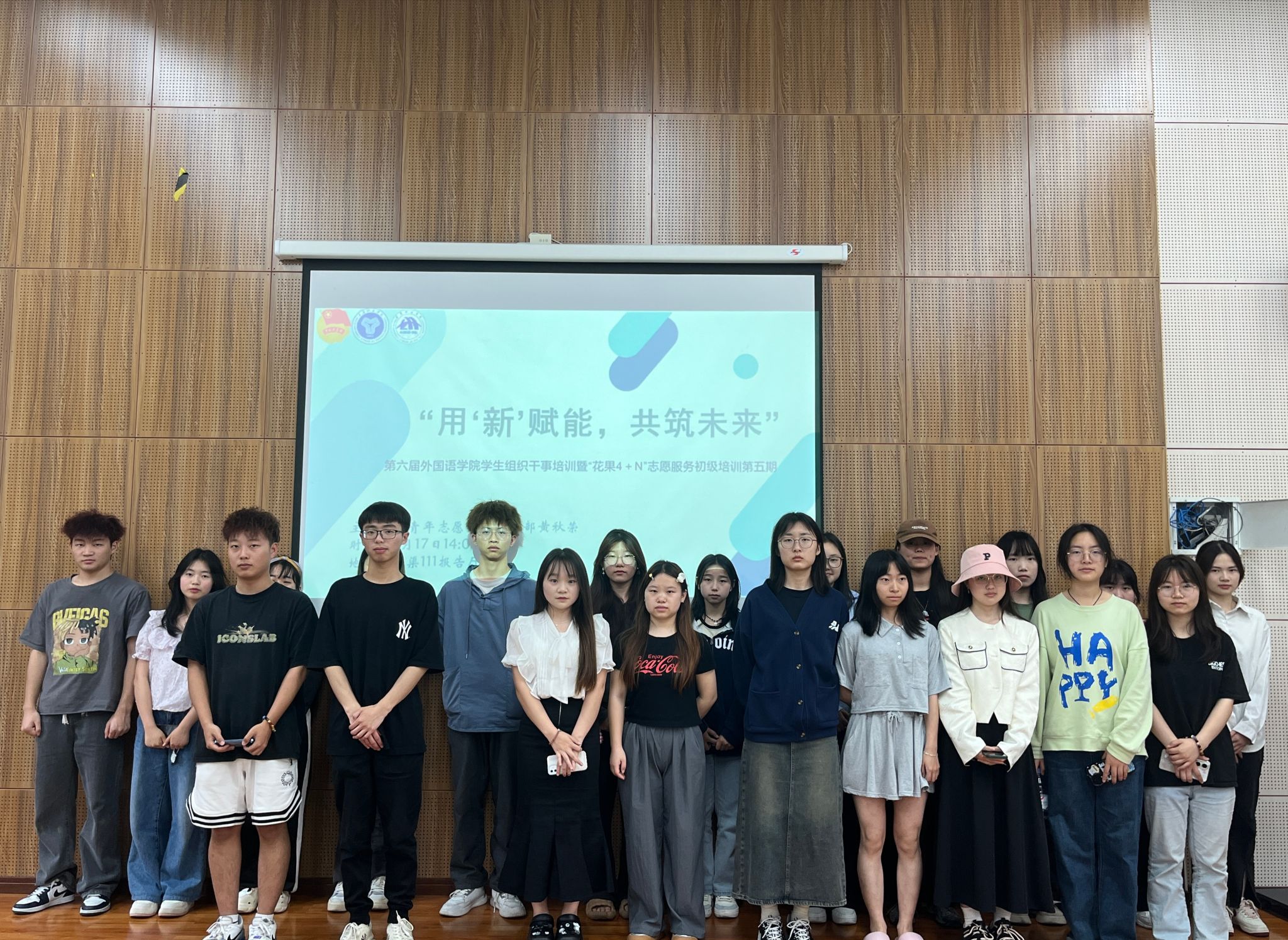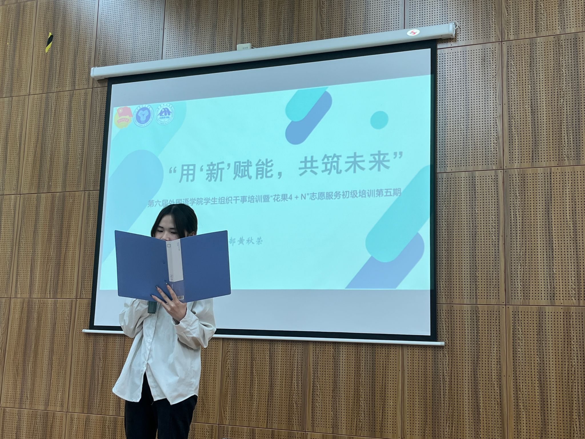 “志愿始于心,奉献在于行。”初夏的阳光洒在大地,万物生长充满生机。在这个充满活力的季节里,投身于志愿服务活动,为社会贡献生生不息的力量。为进一步培养外国语学院学生组织干事志愿精神,营造志愿服务良好氛围,特外国语学院团总支组织部于4月17日下午14:00,在天渠111报告厅举办“用‘新’赋能共筑未来”第六届外国语学院学生组织干事培训暨“花果4+N”志愿服务初级培训第五期。此次培训有幸邀请到青年志愿者协会干部黄秋荣学姐作为主讲人。