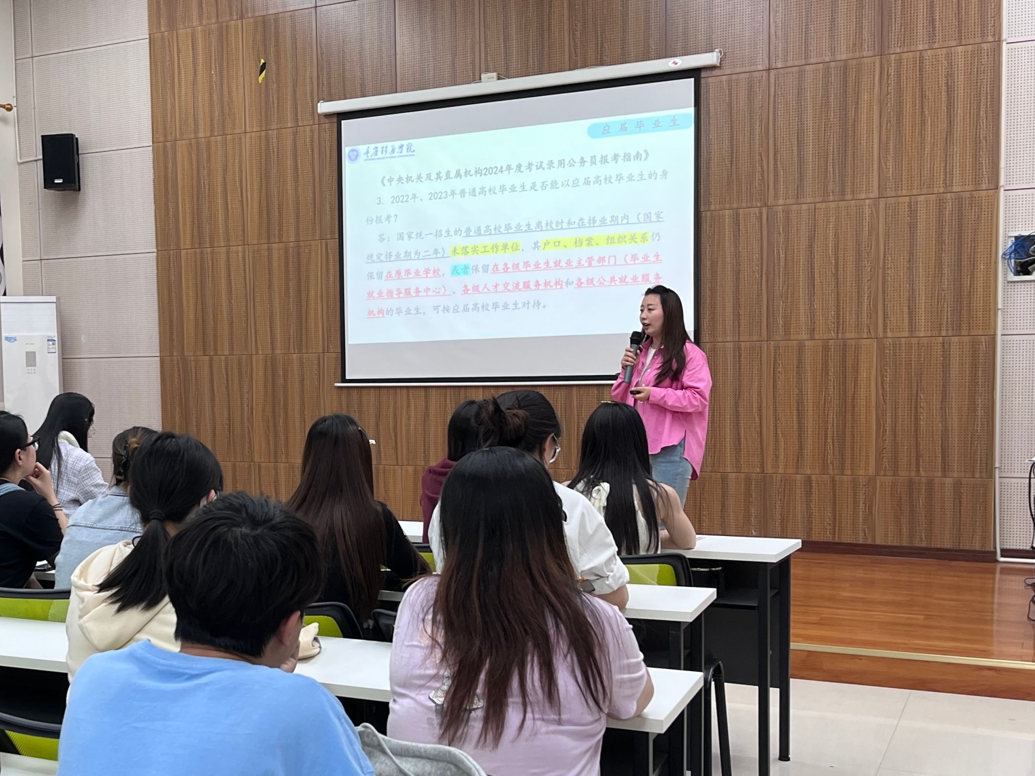踏出校门之外,便在未来的蓝海中扬帆启航。兰老师首先预祝大家周末专八考试顺利。随后从公务员报考指南、人社局事业单位报考和择业期等方面详细讲解应届毕业生的求职优势和应届生身份认定影响因素。同时,通过事例展示让同学们更加直观的了解和明晰求职渠道和面试技巧,学会将自己的优势展现在求职中,提升面试通过率。