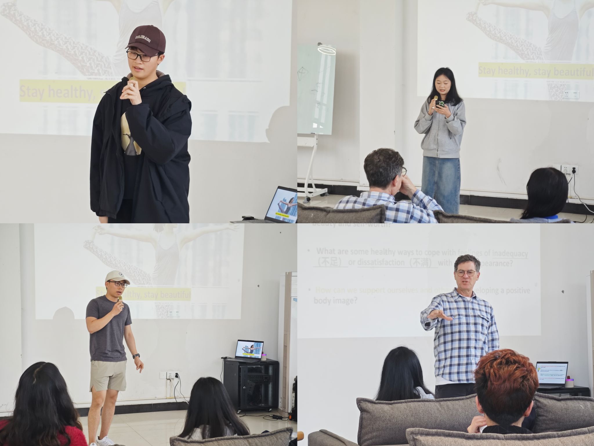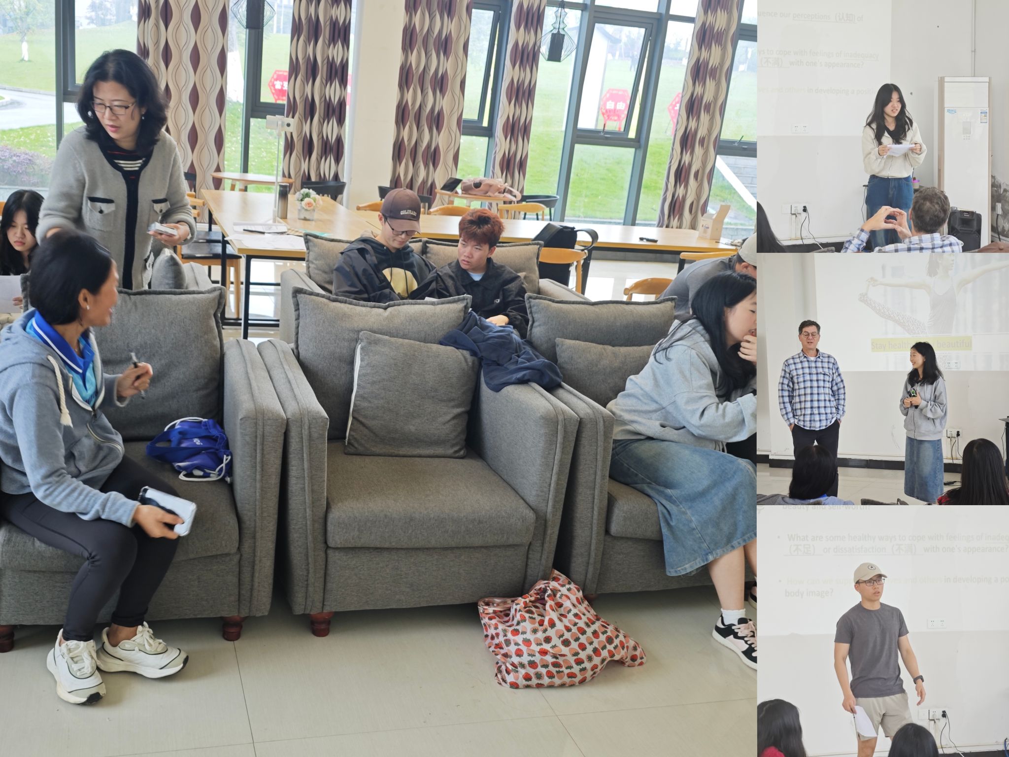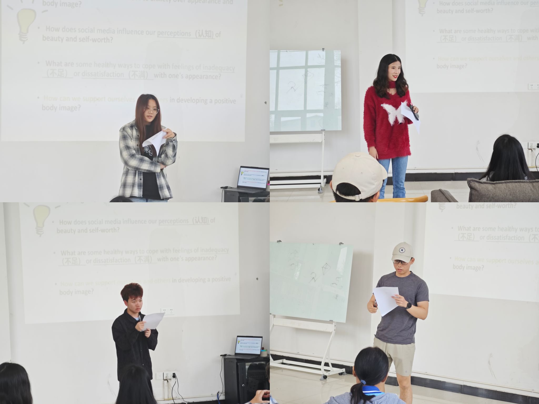 在接下来的Discussion(讨论)环节中,大家就话题:Anxiety about appearance and body image (对于容貌和体形的焦虑)各抒己见:其成因的社会文化因素、其对个人的影响、以及我们如何相互支持并寻求帮助。有趣的是,英语外教Jonathan结合自己在马来西亚、泰国以及中国的经历,分享了在不同的国家、不同的文化里,人们对外貌和体形的焦虑点的不同。讨论中,师生们认真倾听、提问探讨、交流看法;现场氛围开放、包容、活跃、轻松自然。
