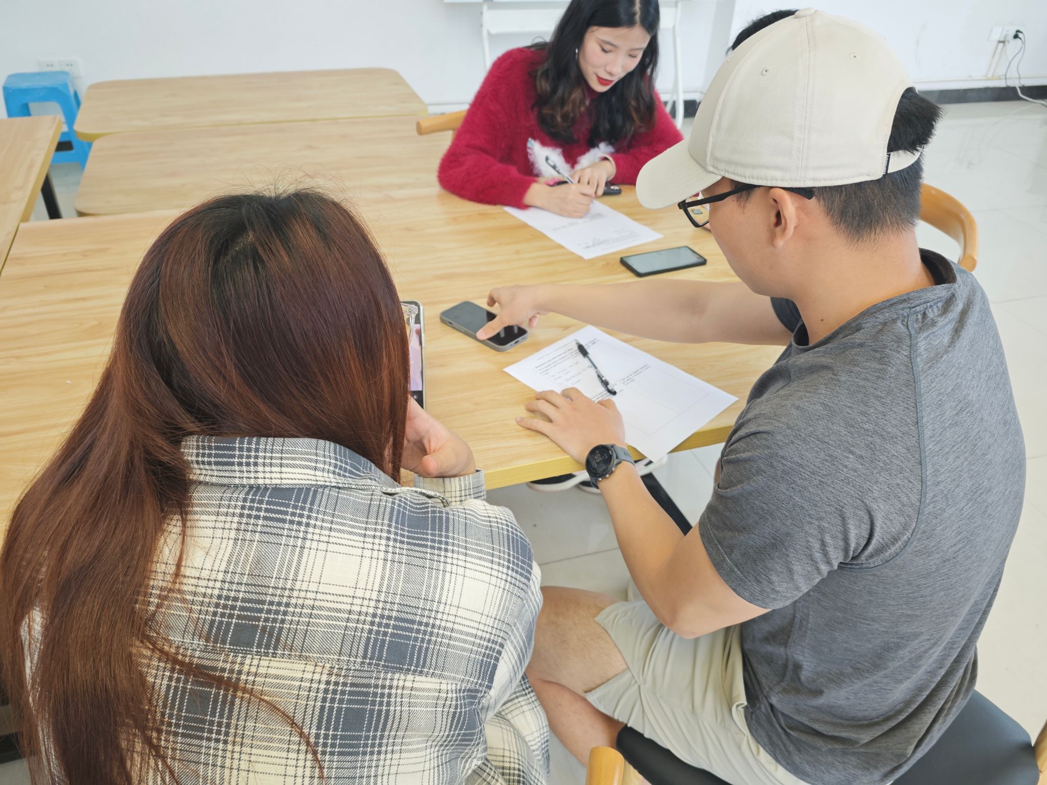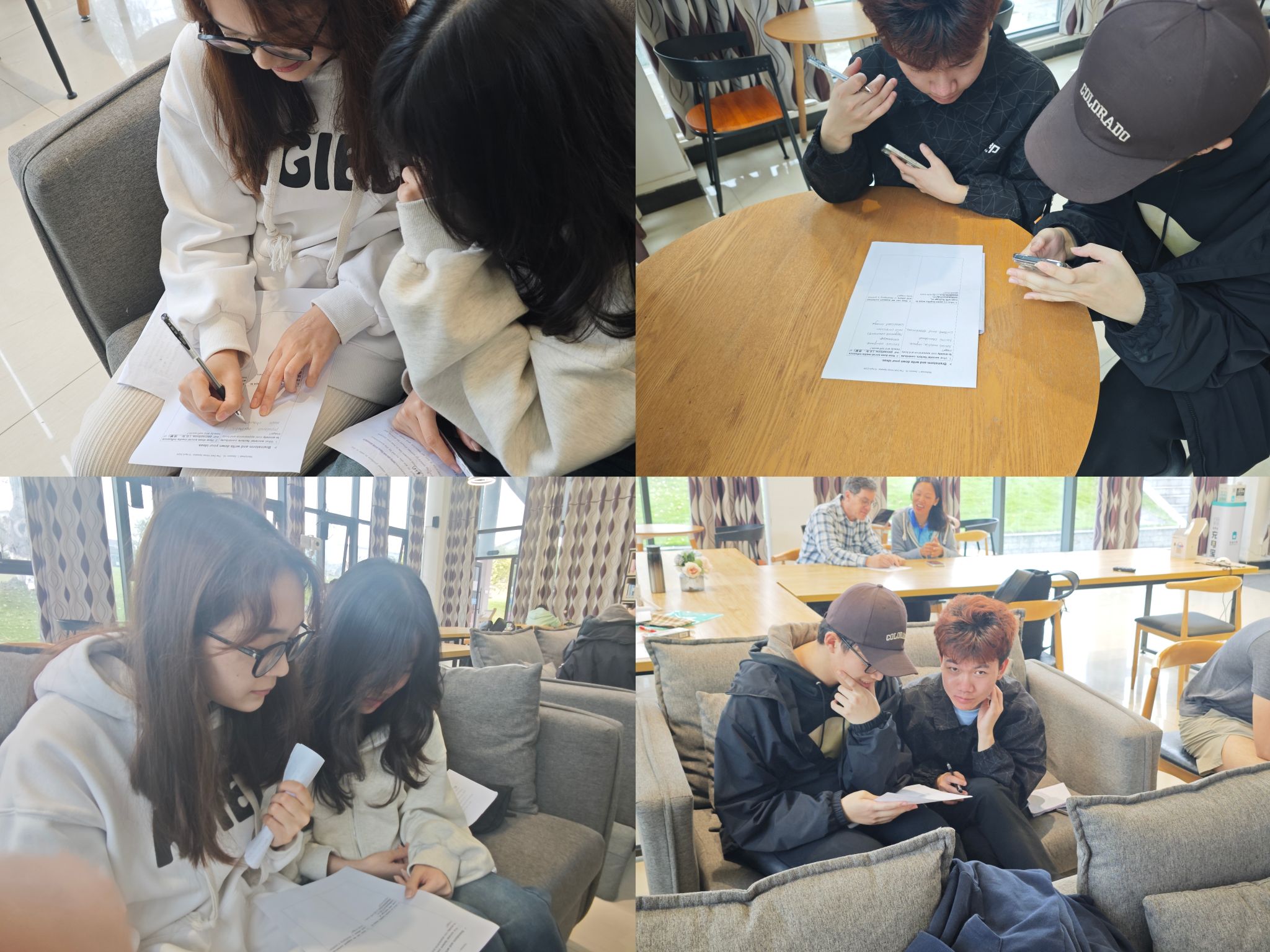 好记性不如烂笔头。发言之前,杨沁霏老师鼓励同学们两人一组,用约10分钟的时间,把讨论中的关键词,写到练习纸上,并借助手机字典,查搜单词和相关信息。同学们不仅要和他人合作学习、还要筛选有效信息、并通过小组讨论,使思路更加清晰。大家增进了了解、取长补短、语言学习的过程显得更为生动有趣。