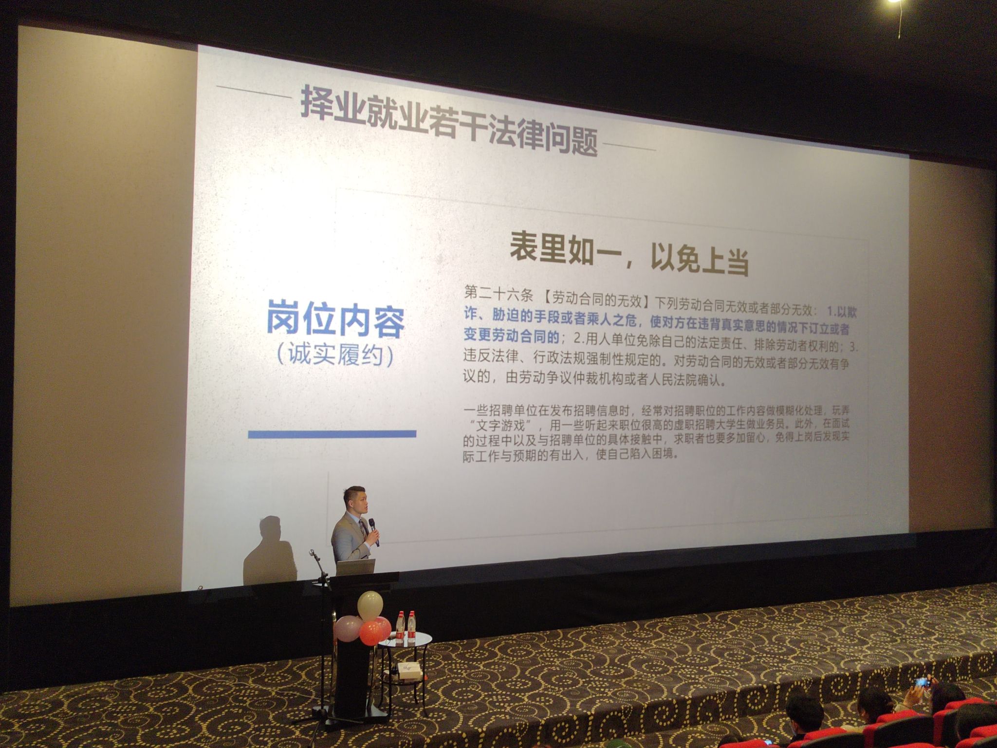 就业权益是指劳动者在就业过程中所拥有的权力和所应该获得的利益。就业权益是一种合法权益,劳动者在国家法律允许的范围所实现的就业及其权益受到法律保护。需要特别指出的是,任何权益都是和责任与义务连在一起的,权利、责任、义务是相等对应的。劳动者的就业权益也是和劳动者的就业责任、就业义务相互联系的。为了能让同学们在实习的时候能够保护好自己的权利,同时也为同学们提供一些就业经验,为以后的就业提供保障。2023年11月15日下午16:00--18:00外国语学院学生会权益部与团总支就业助理团在万画影厅二号厅举办了就创权益保护讲座,本次讲座有幸邀请到了北京浩天(重庆)律师事务所党支部书记,诉讼法学硕士郑浩律师对求职创业的法律风险、劳动合同核心条款、法律规定等相关内容进行分享。