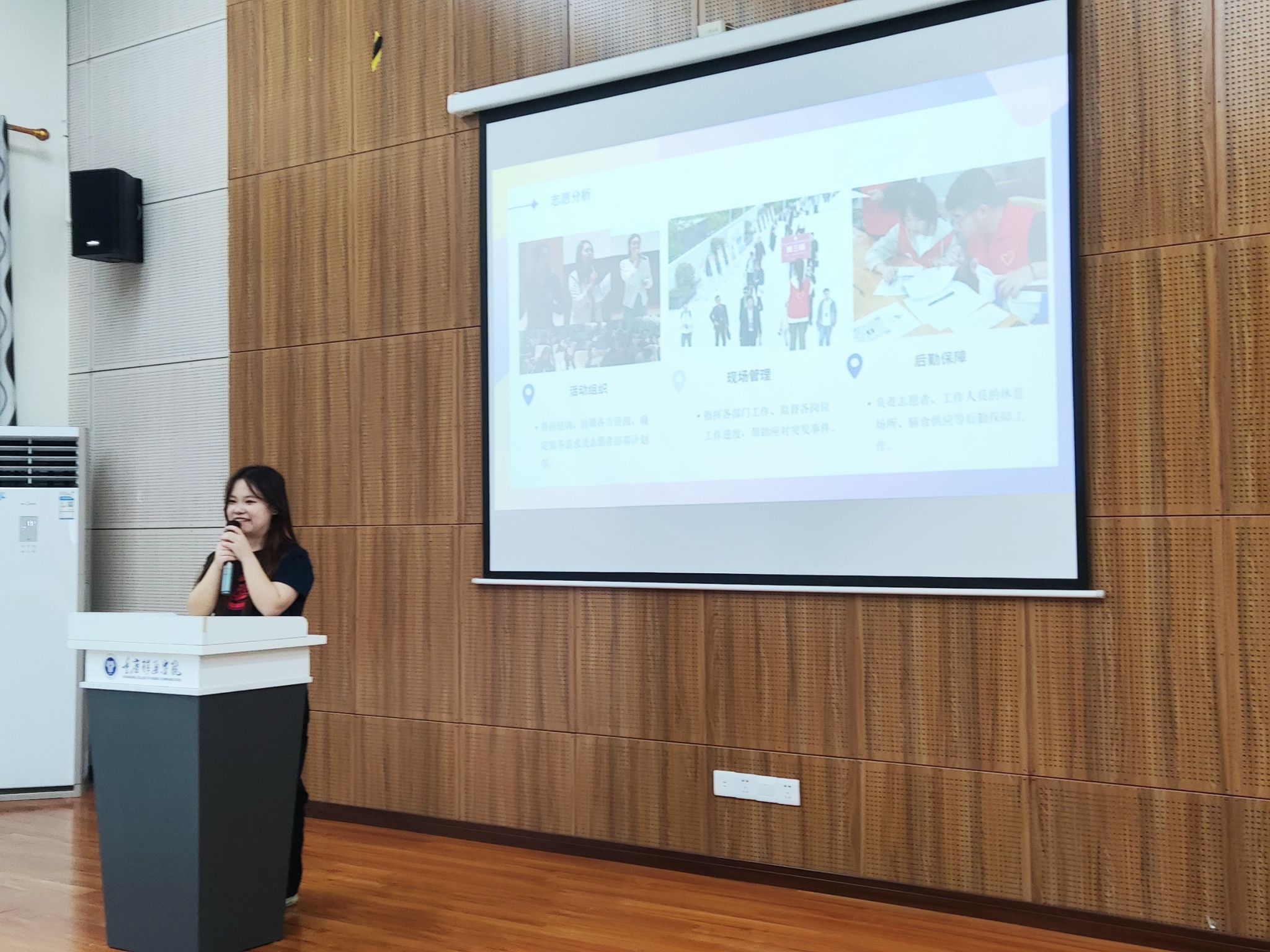 最后,曾静雪同学总结了赛会志愿服务活动在各个层面的具体工作,包括赛事策划、现场管理、嘉宾接待、安全保障、活动宣传等多个方面。详细阐述了如何在实际工作中将赛会服务理念落到实处,让志愿者们深刻理解到赛会服务的内涵和价值。整个讲解过程中,曾静雪同学利用较为清晰的条理和丰富的示例,让参会人员对赛会志愿服务活动有了更为全面的认识。她的讲解不仅详尽地展示了赛会服务工作的方方面面,还激发了同学们对赛会服务工作的热情和信心,为今后类似活动的开展奠定了坚实的基础。