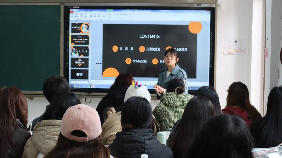 “开学第一课”具体包括回归校园、心理健康、安全教育、反诈教育以及职业规划五个部分。关于“回归校园”于老师讲解道,同学们应建立积极健康的学习心态,从容地面对学习;心理健康、安全教育、反诈教育一直是学校教育的热门话题,于老师通过《开学第一课》,引导同学们提升心理素质,强化安全意识与自我保护能力,并以实例揭示诈骗手段,提升同学们的防范意识;在职业规划中,于老师告诉同学们要明确生涯目标,科学规划路径,提升自我竞争力与人生规划意识。