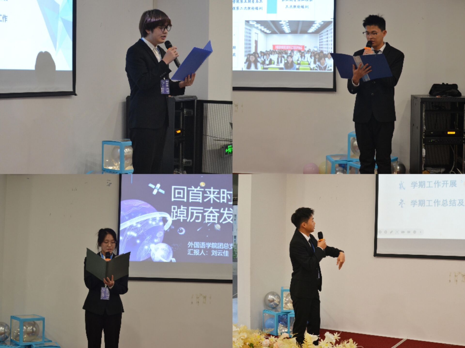 大会以外国语学院全体成员奏唱《中国共产主义青年团团歌》正式拉开帷幕。展学生组织活力风采,构我院完满画卷,以学期回顾视频的形式,将本学期学生组织工作的点点滴滴呈现,一幕幕画面出现在眼前、一次次活动举办的场景在脑海中浮现、一张张青春合影闪过,无一不记录着第四届第一任学生组织的辛勤付出和成长历程,希望四届一任学生组织全体成员在今后的学生组织工作中,在回顾中汲取经验与教训,不畏将来拼搏奋斗,共同书写属于四届一任学生组织的完满篇章。