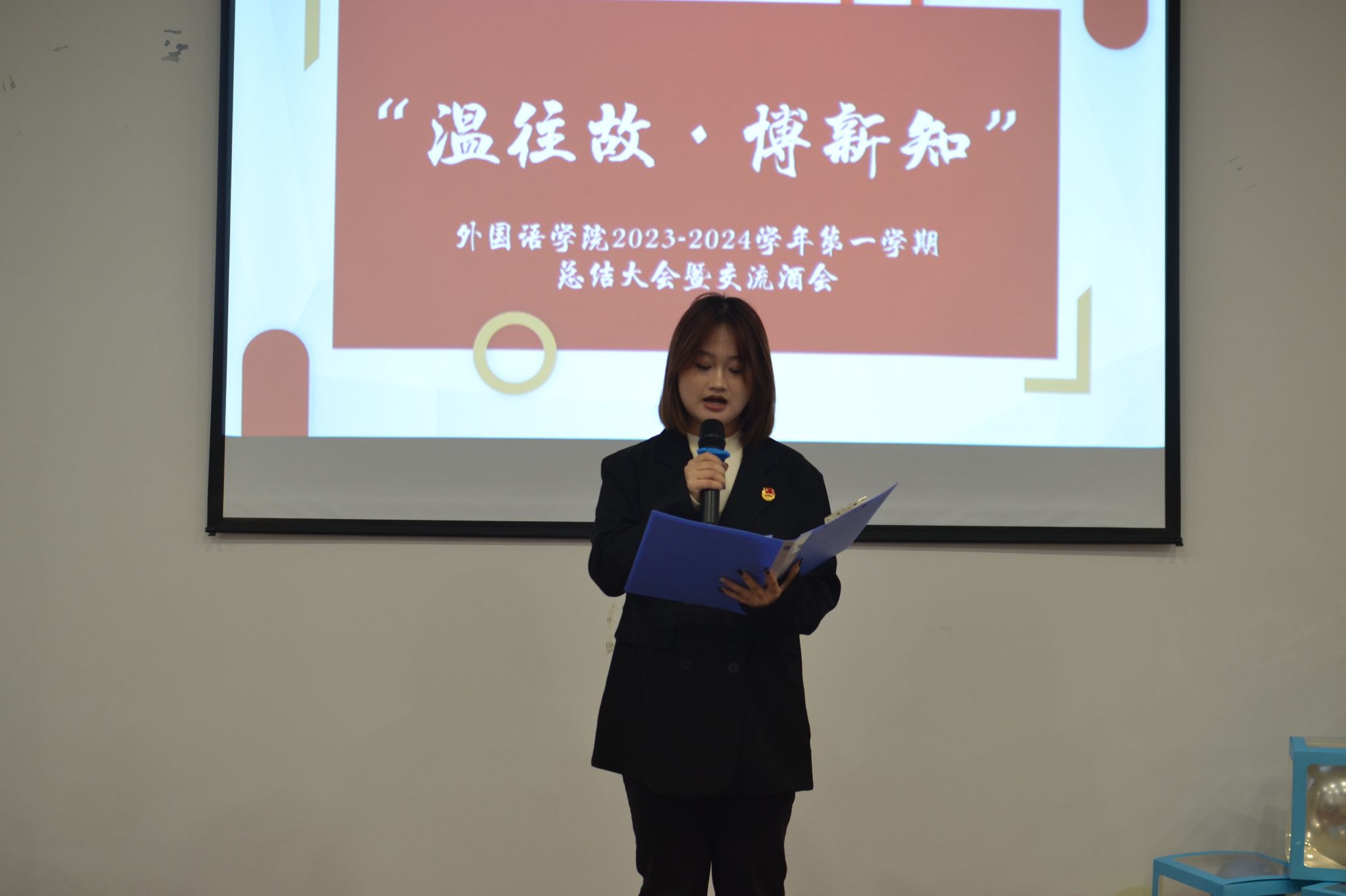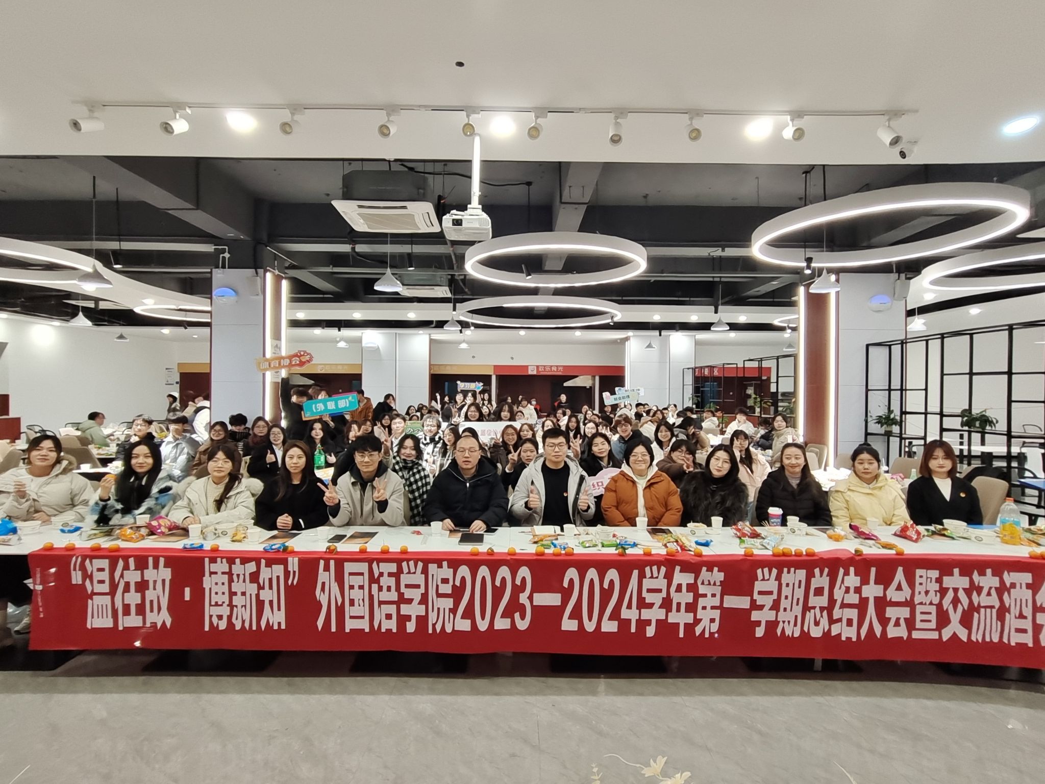 寒冬已至,学期将过。部门合作,温往故经验共享;知识拓展,博新知智慧同行,为营造良好学生组织氛围,缓解学生学习中的烦恼,为后期工作积蓄内力。特外国语学院团总支组织部于12月20日16:00,在C食堂三楼成功举办“温往故,博新知”外国语学院2023—2024学年第一学期总结大会暨交流酒会。莅临本次大会的嘉宾有外国语学院副院长马喆老师,外国语学院团总支书记吕戈老师,校团委杨婕老师及外国语学院2020-2023级全体辅导员。