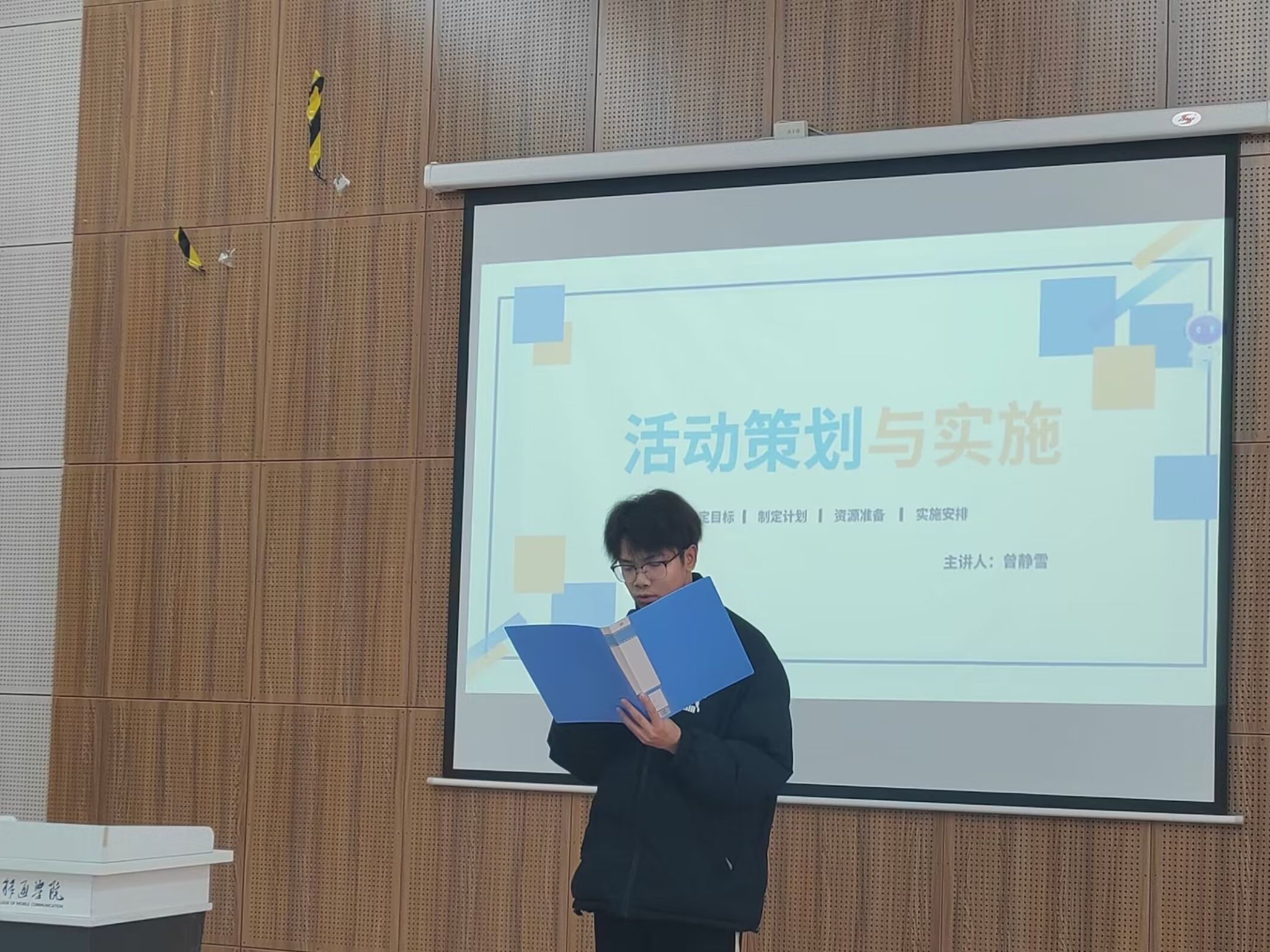紧接着,曾学姐从活动策划为大家进行讲解。策划活动需要考虑各种资源的配备和预算,以确保活动的顺利进行并取得成功。在策划过程中,需要充分考虑场地、设备、人力和物资等资源的配备情况,并制定合理的预算,以确保活动能够有序进行。同时分享自身经历,让大家更好地理解如何在实际工作中运用所学知识。