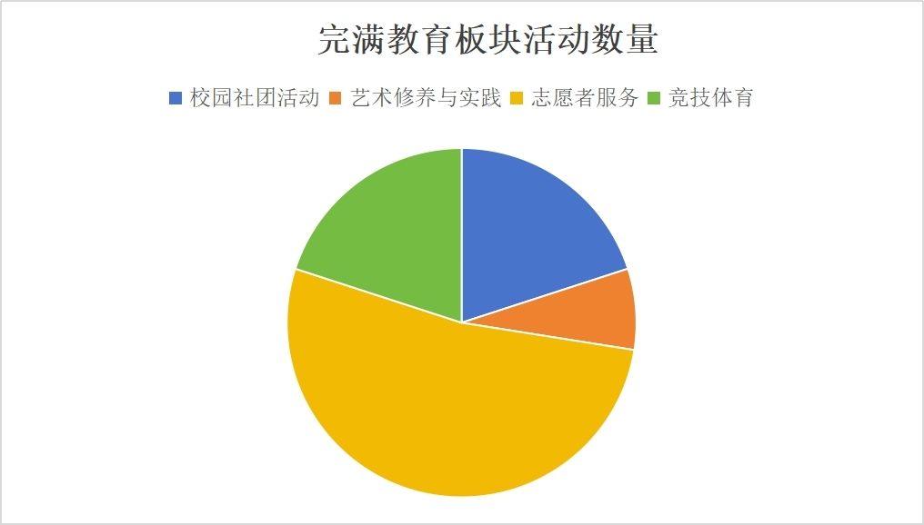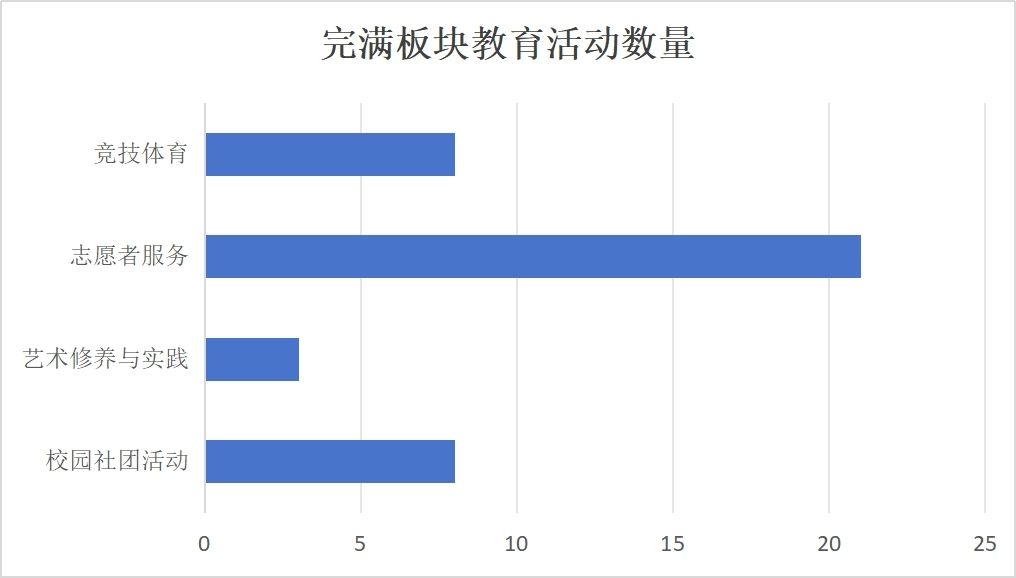外国语学院完满教育活动中,达700人积极参与完满教育活动,且该月人均参与活动数达12场。完满教育旨在完满、全面发展。由本月数据可见,外国语学院的小伙伴们在各方面发展比较健全,但艺术修养与实践板块还存在发展短板问题。